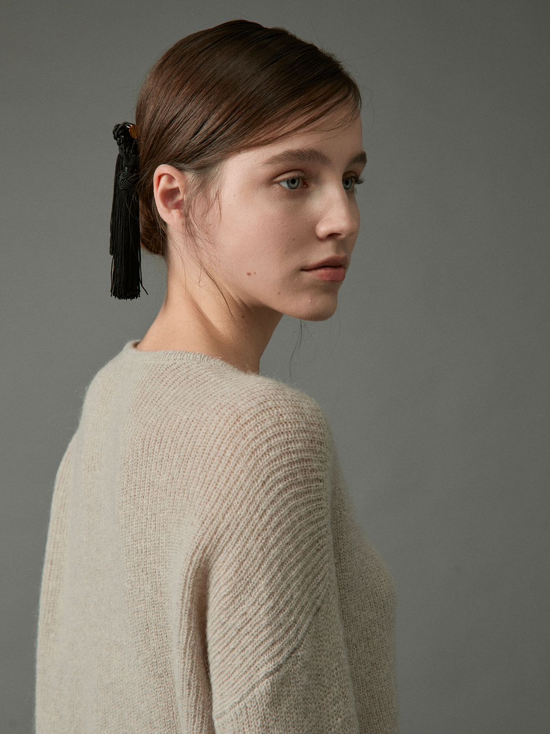 섬세하게 편직된 조직이 은은한 헤어감과 고급스러운 텍스처를 보여주며, 가벼운 두께감에도 뛰어난 보온성을 지니고 있습니다.