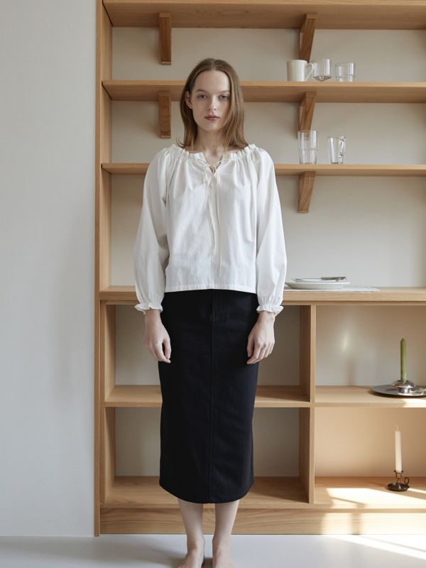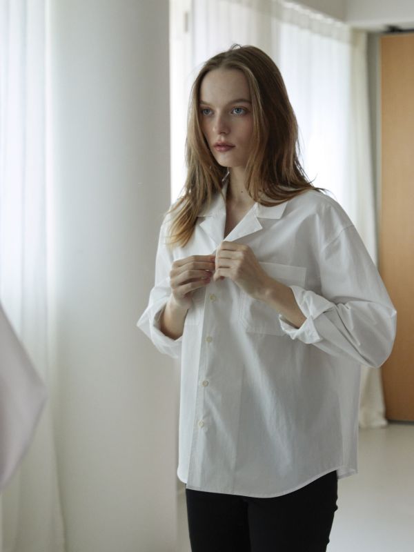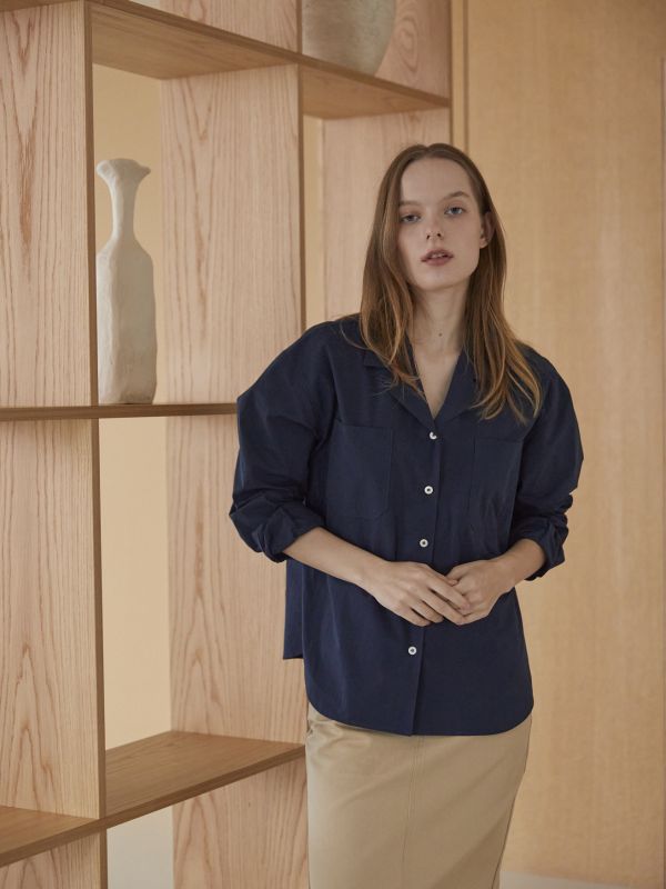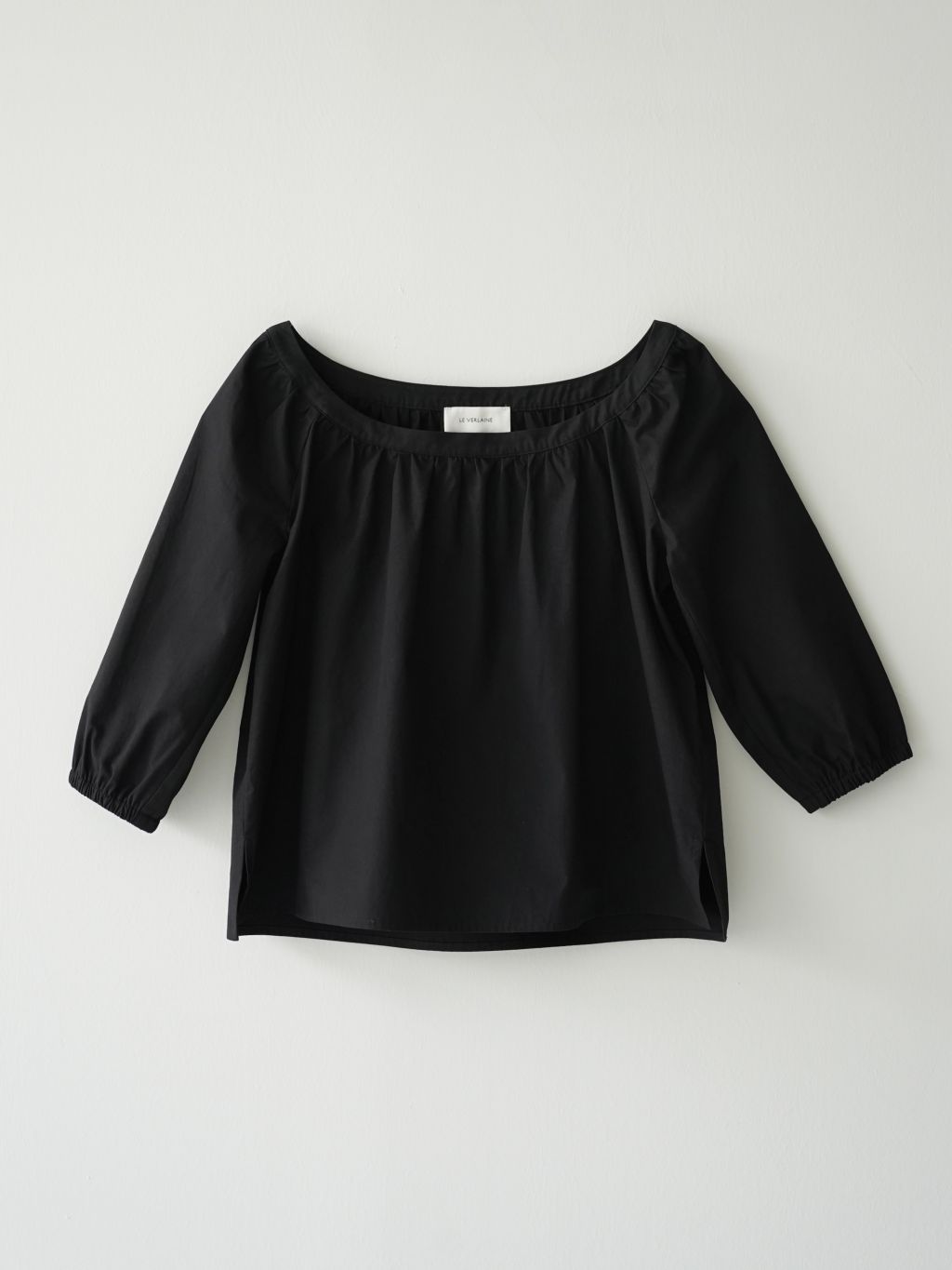 목과 어깨 라인이 강조되는 와이드 라운드넥 블라우스