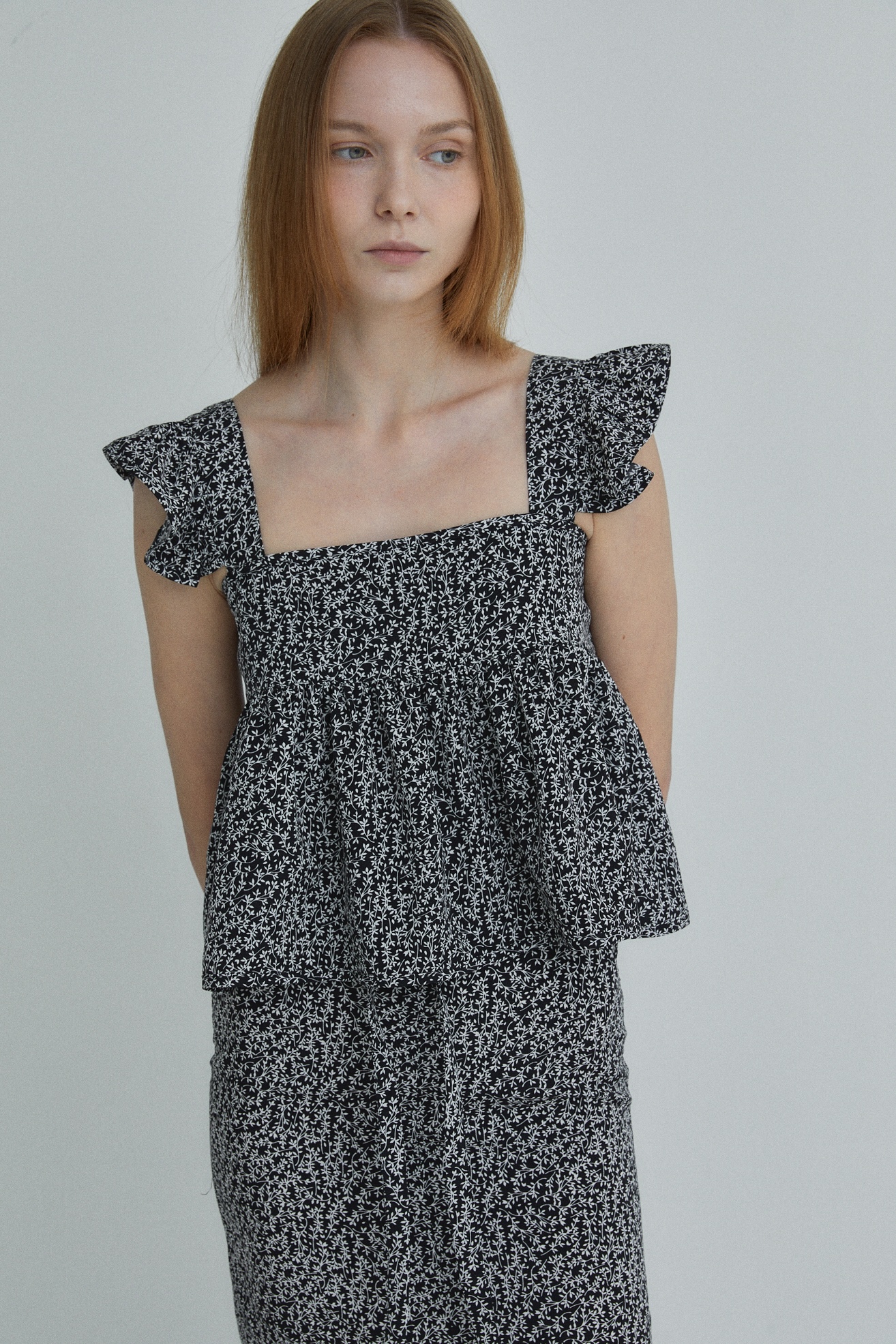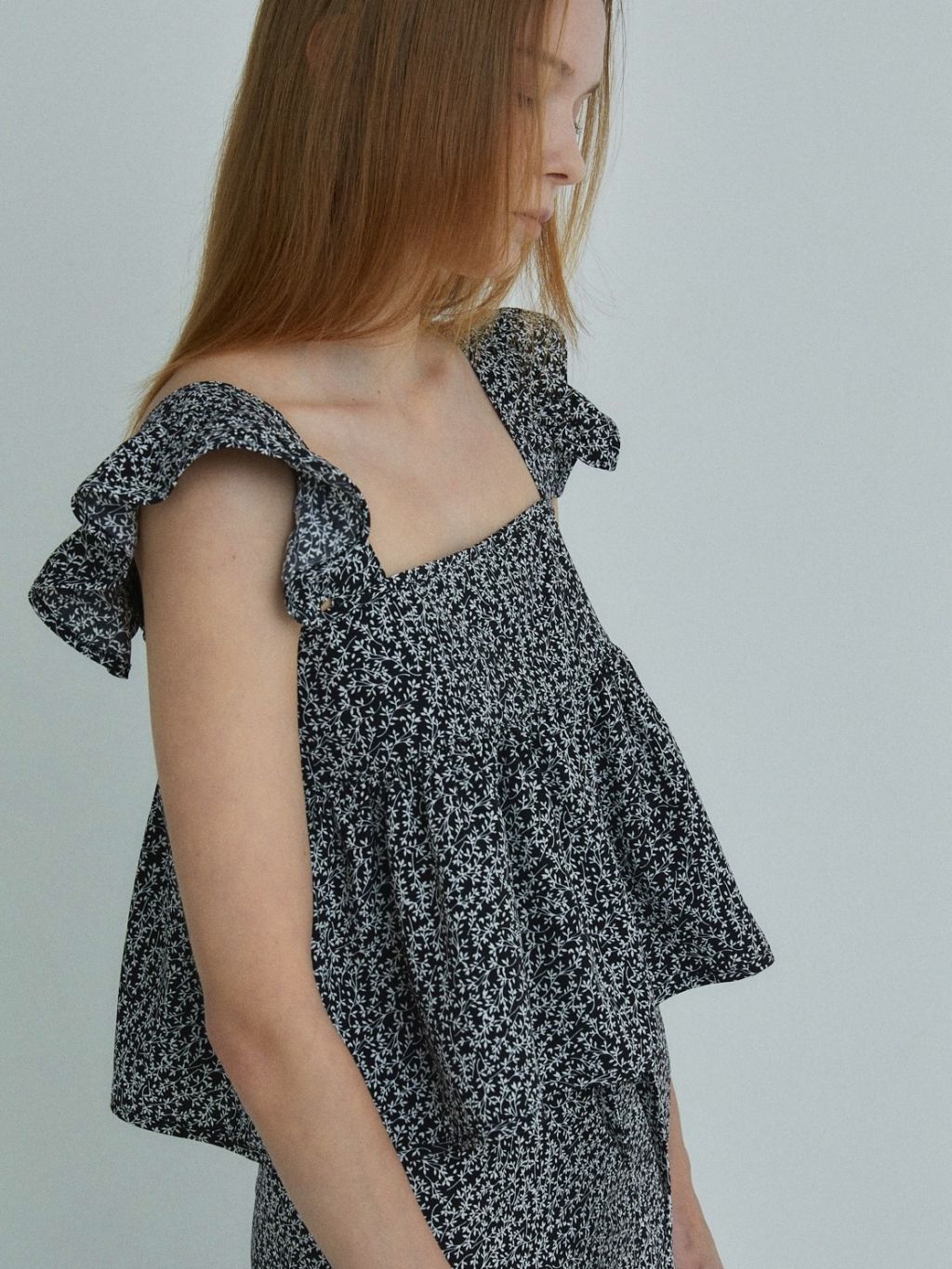 어깨 셔링 디테일과 가슴 아래로 갈수록 퍼지는 라인이 러블리한 스퀘어넥 블라우스