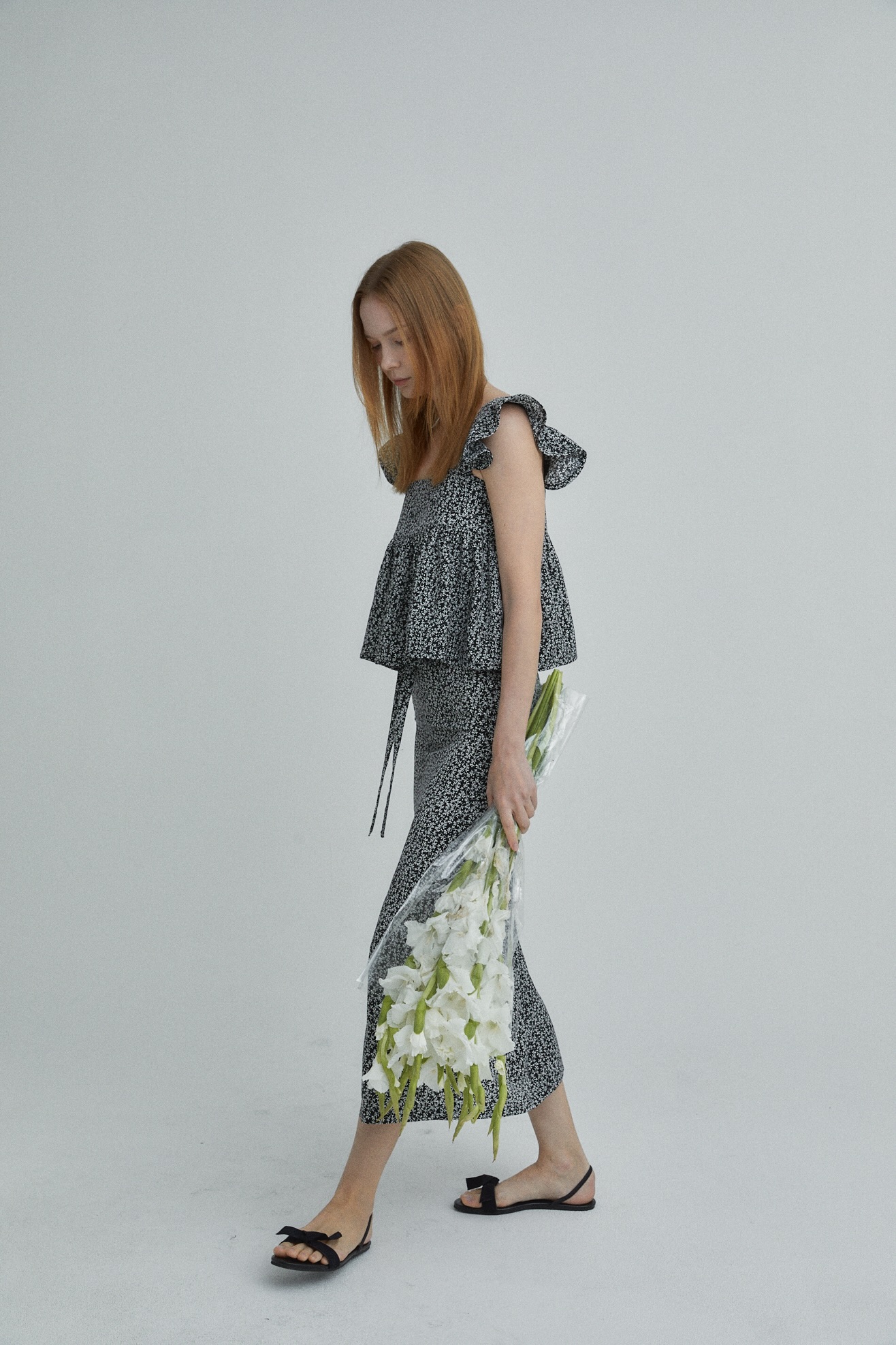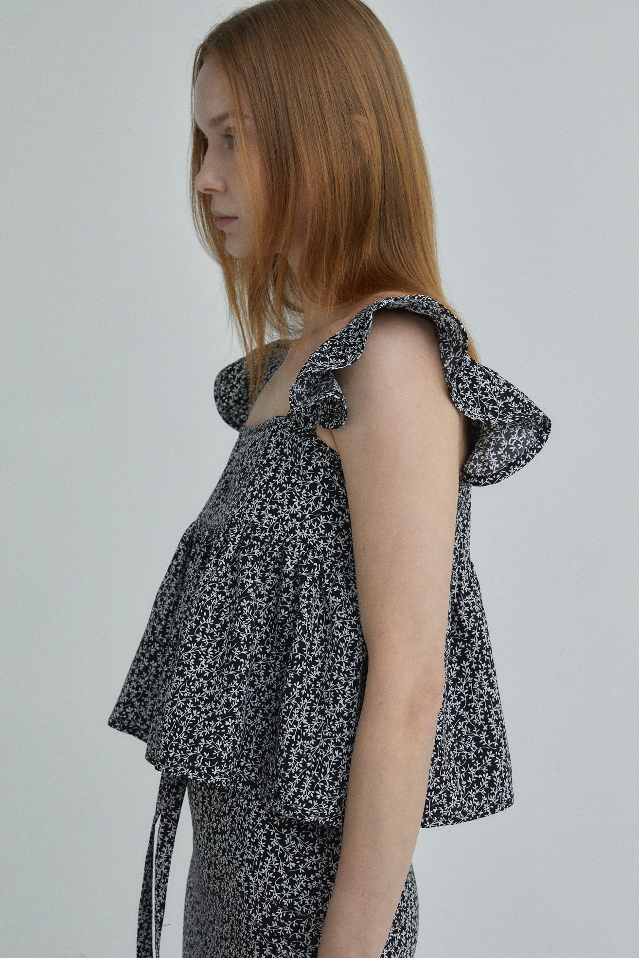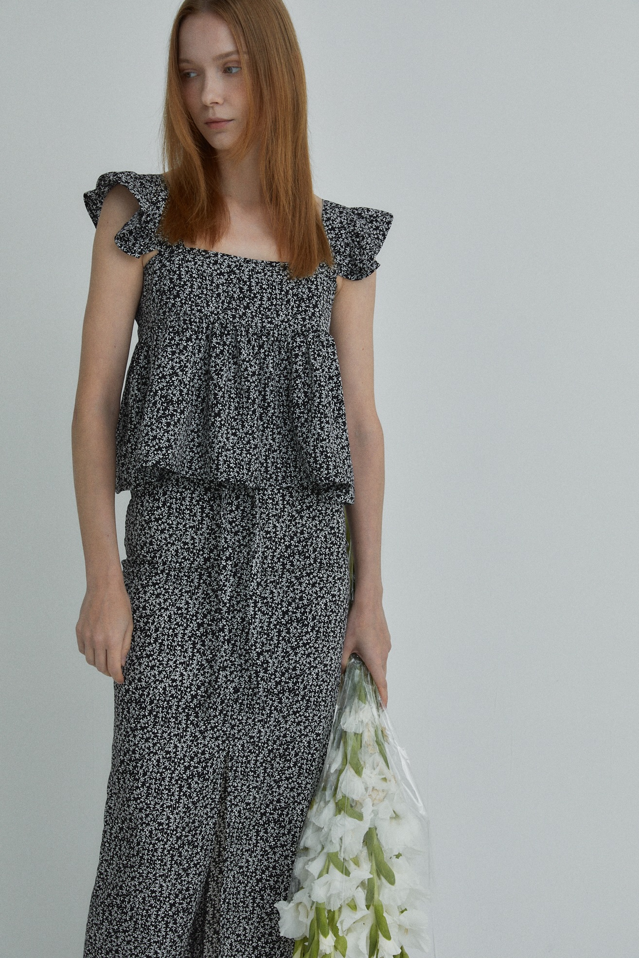 잔잔한 플로럴 소재로 페미닌 무드 강조
