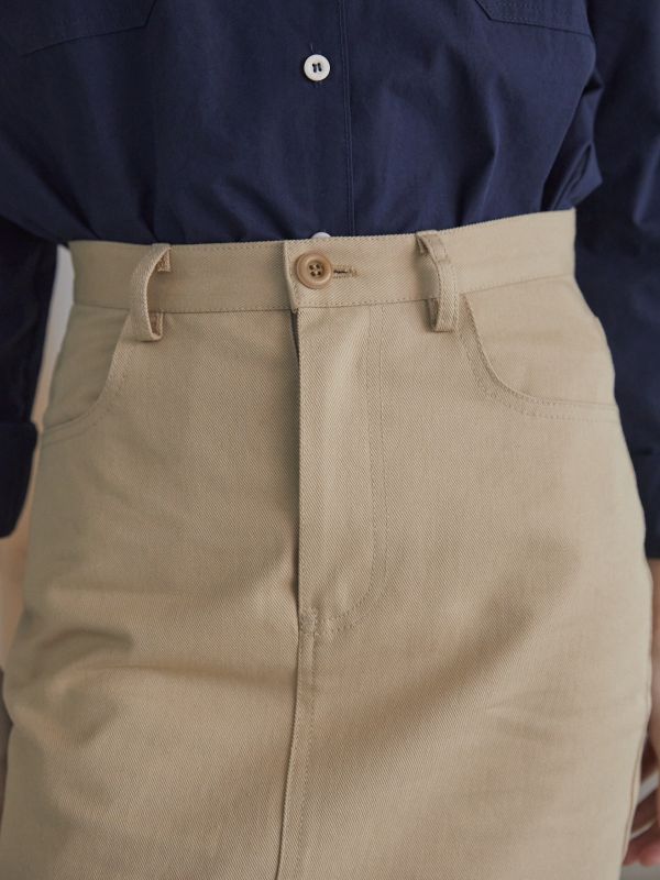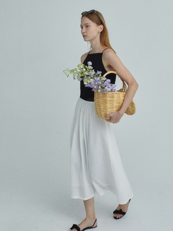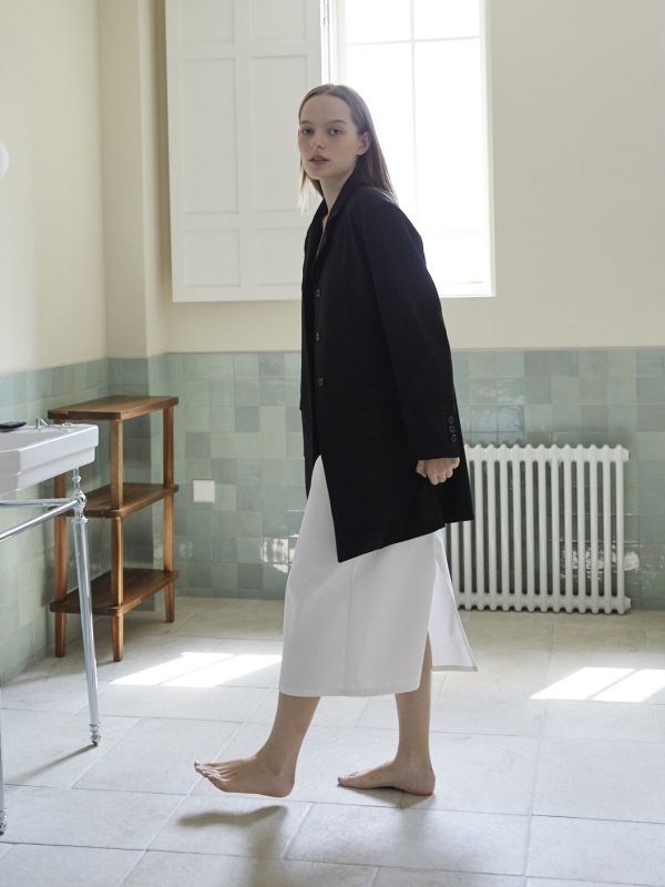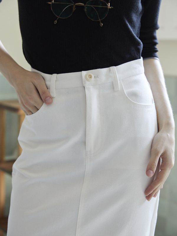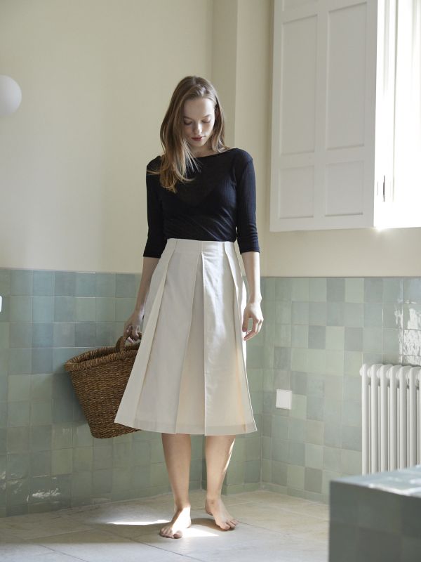 양 사이드의 핀턱과 넓은 밑단 스티치가 포인트인 H라인 스커트
