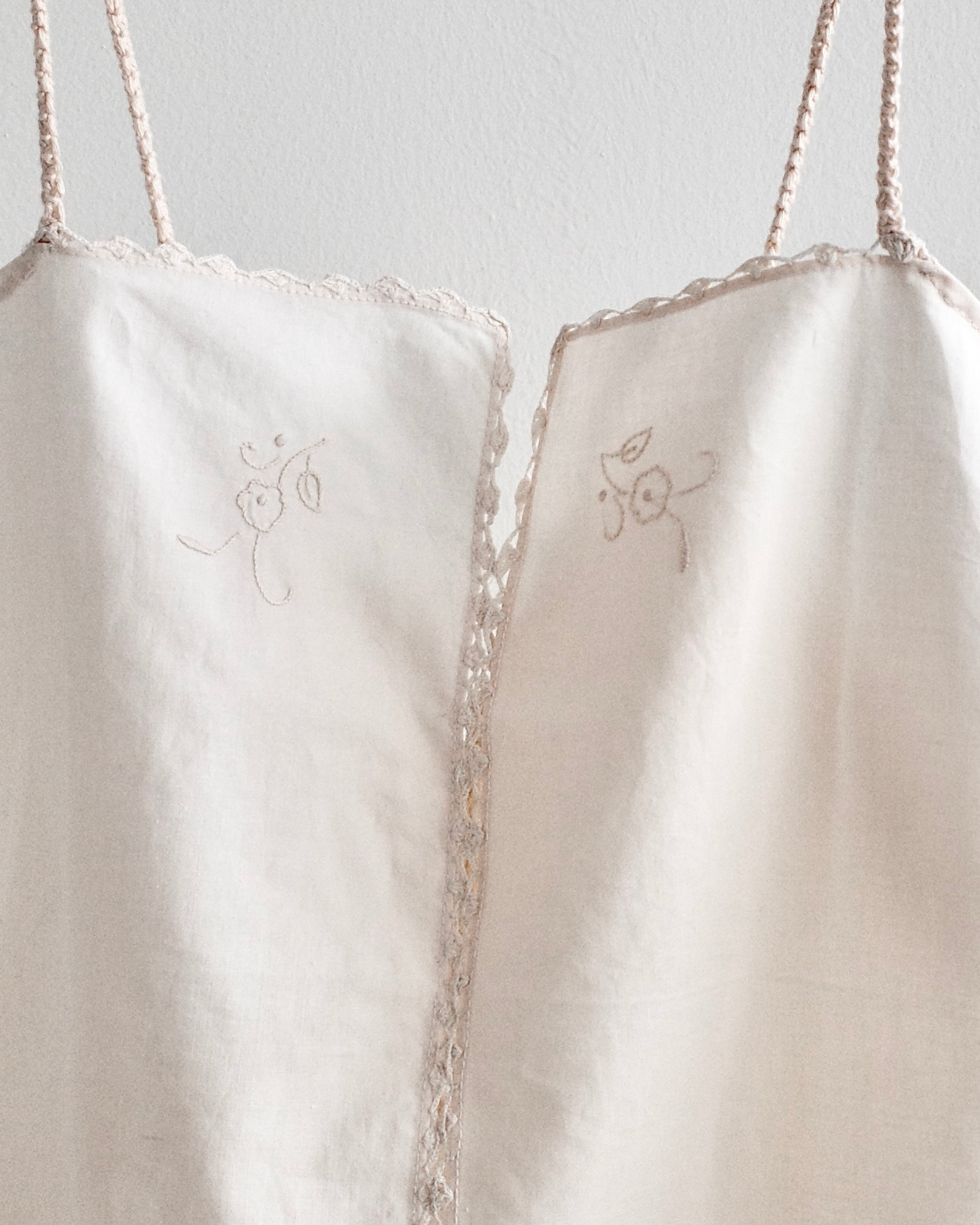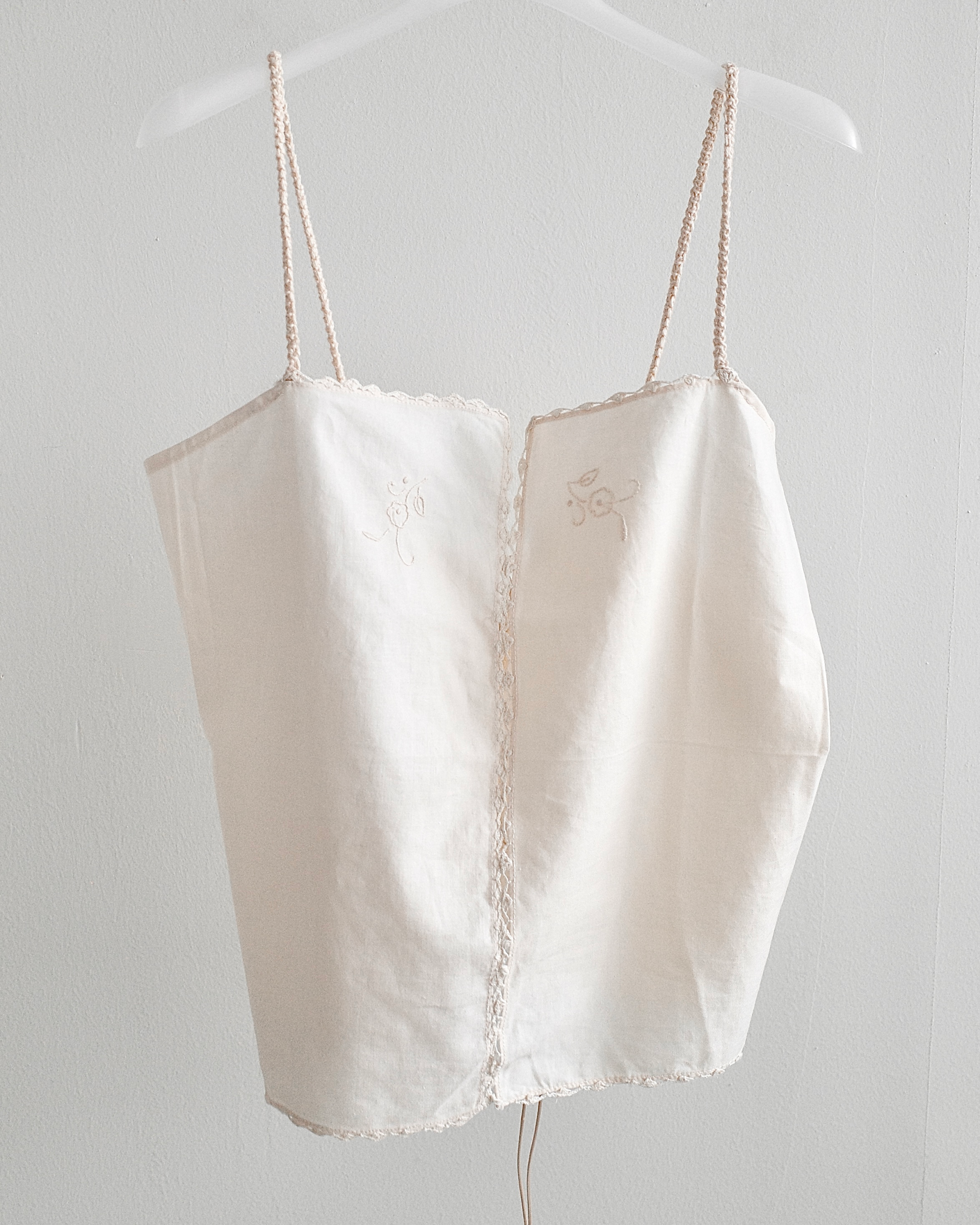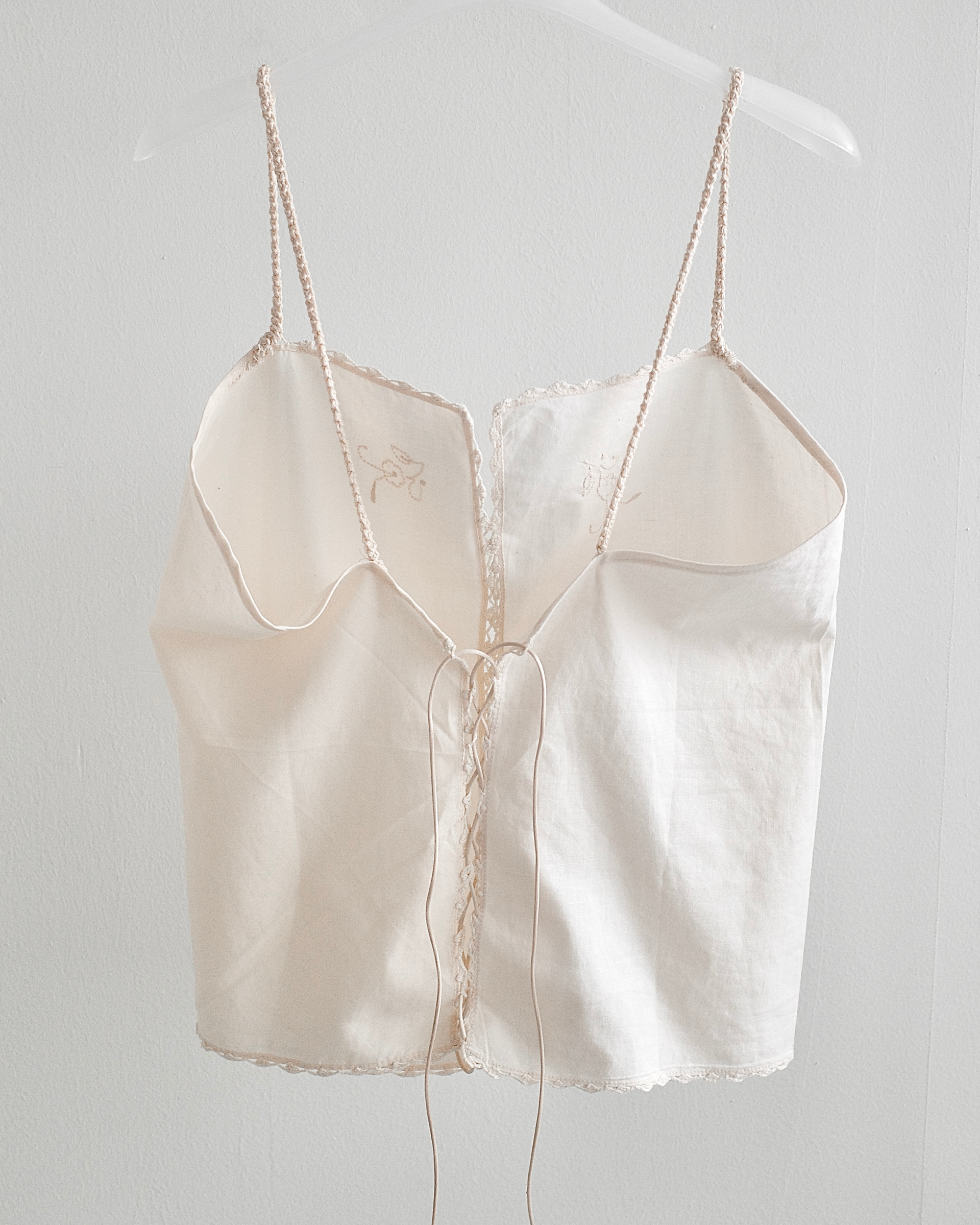 베이지 컬러의 코튼 크로셰 탑입니다. 손으로 수놓은 자수 디테일과 레이스 짜임이 섬세하며, 빈티지한 무드와 함께 자연스러운 실루엣을 연출합니다. 뒷면의 리본 스트랩으로 핏을 조절할 수 있어, 체형에 맞게 착용가능합니다.