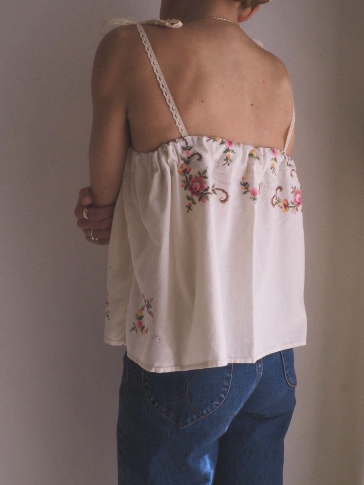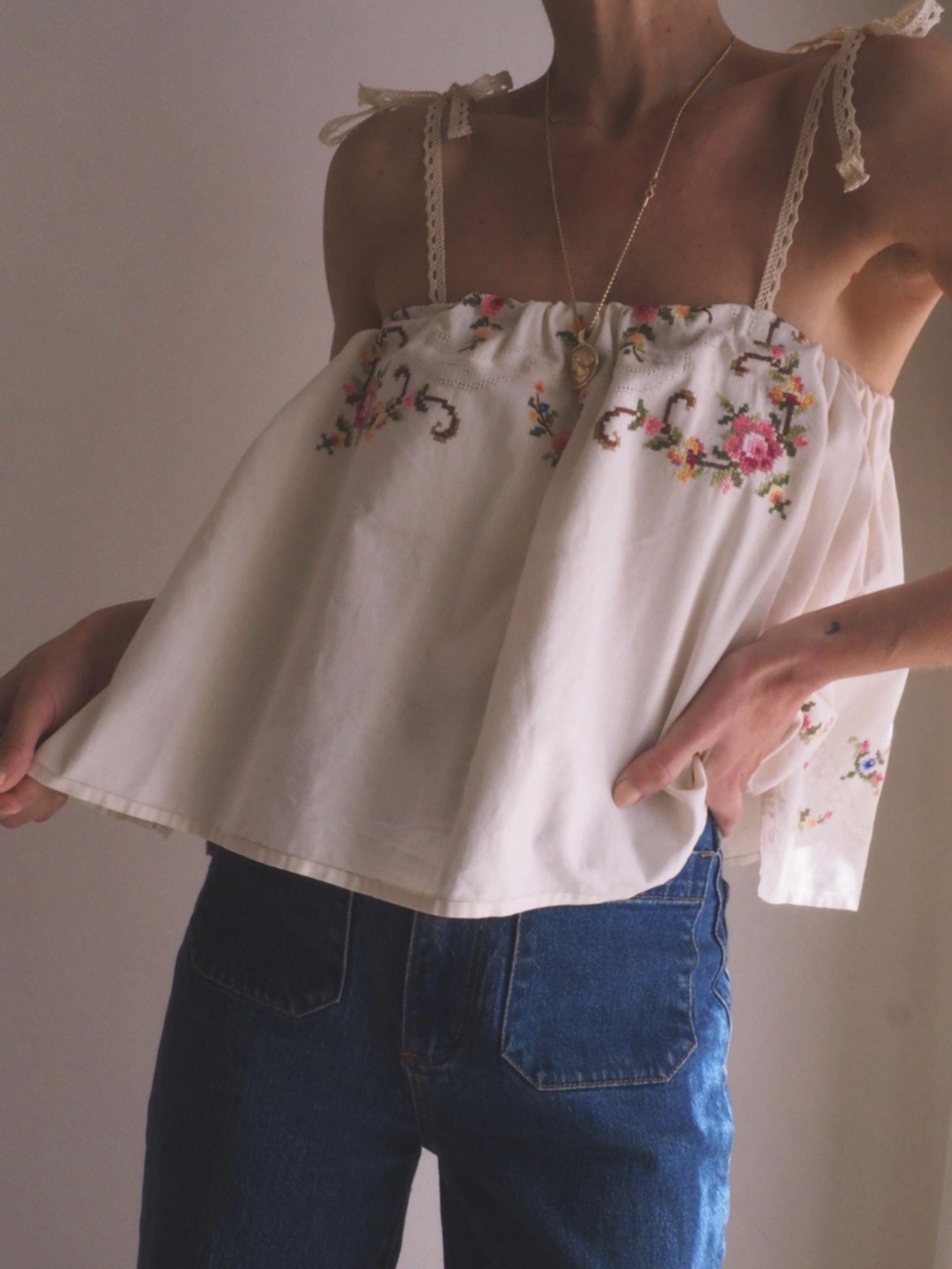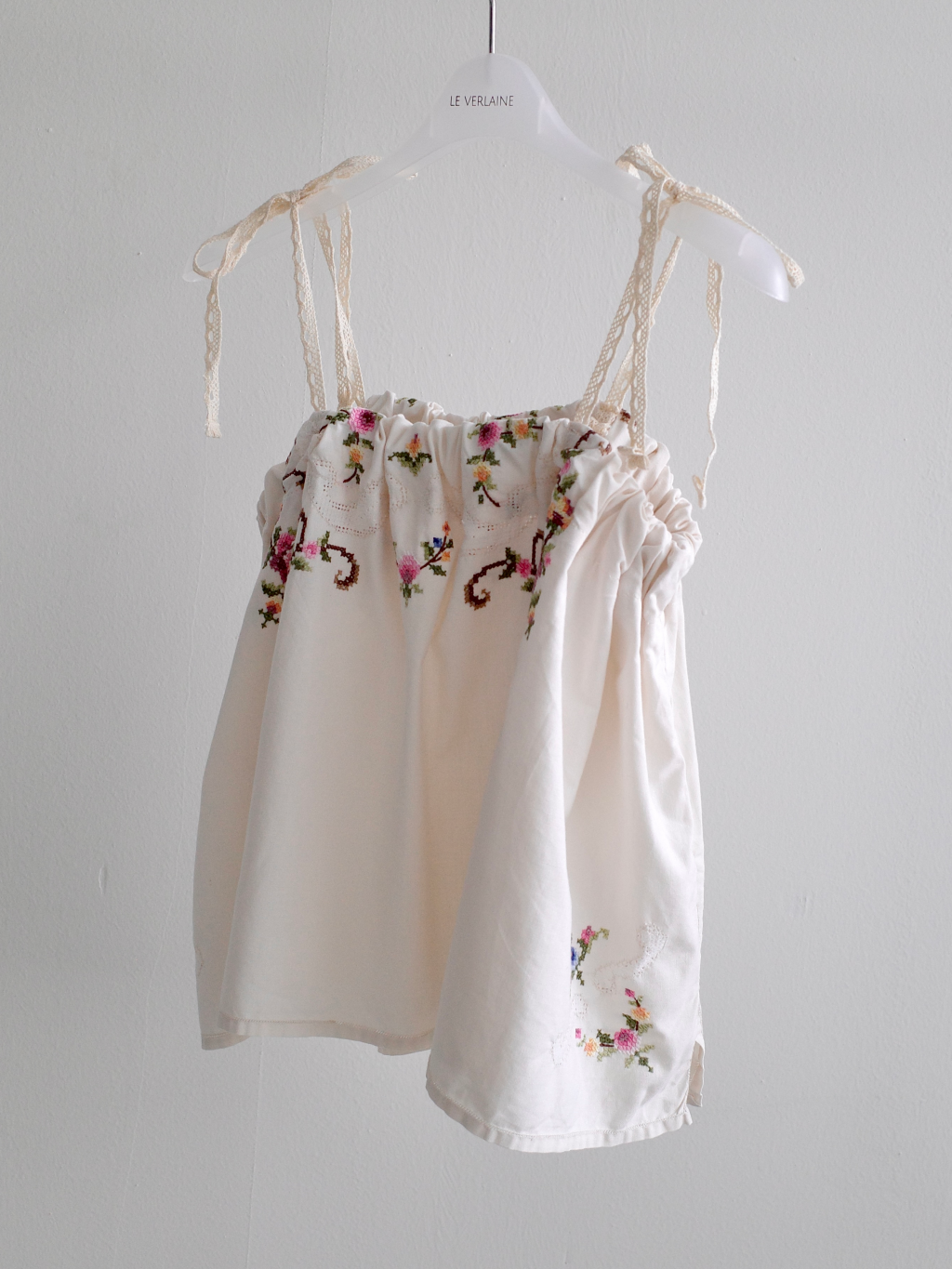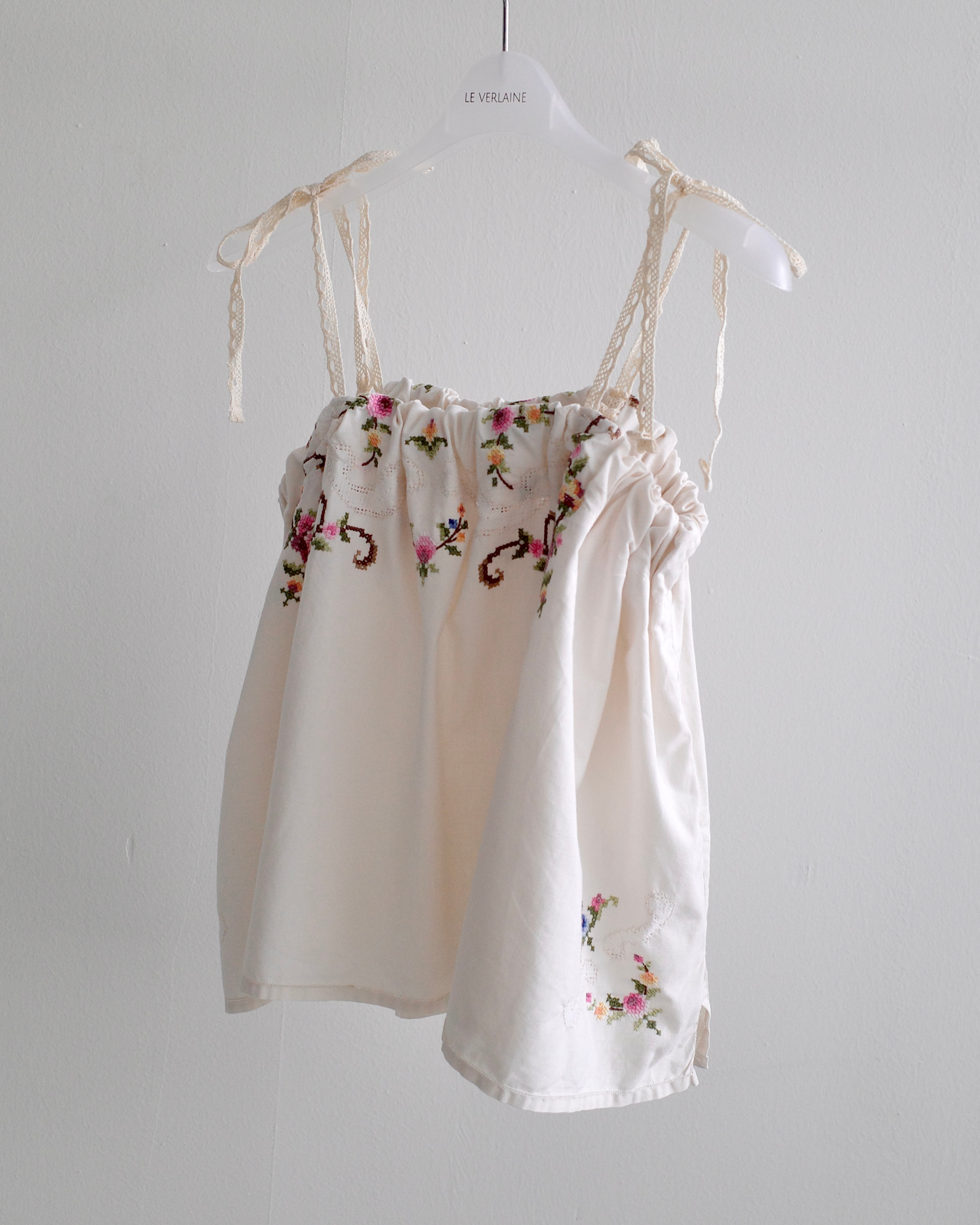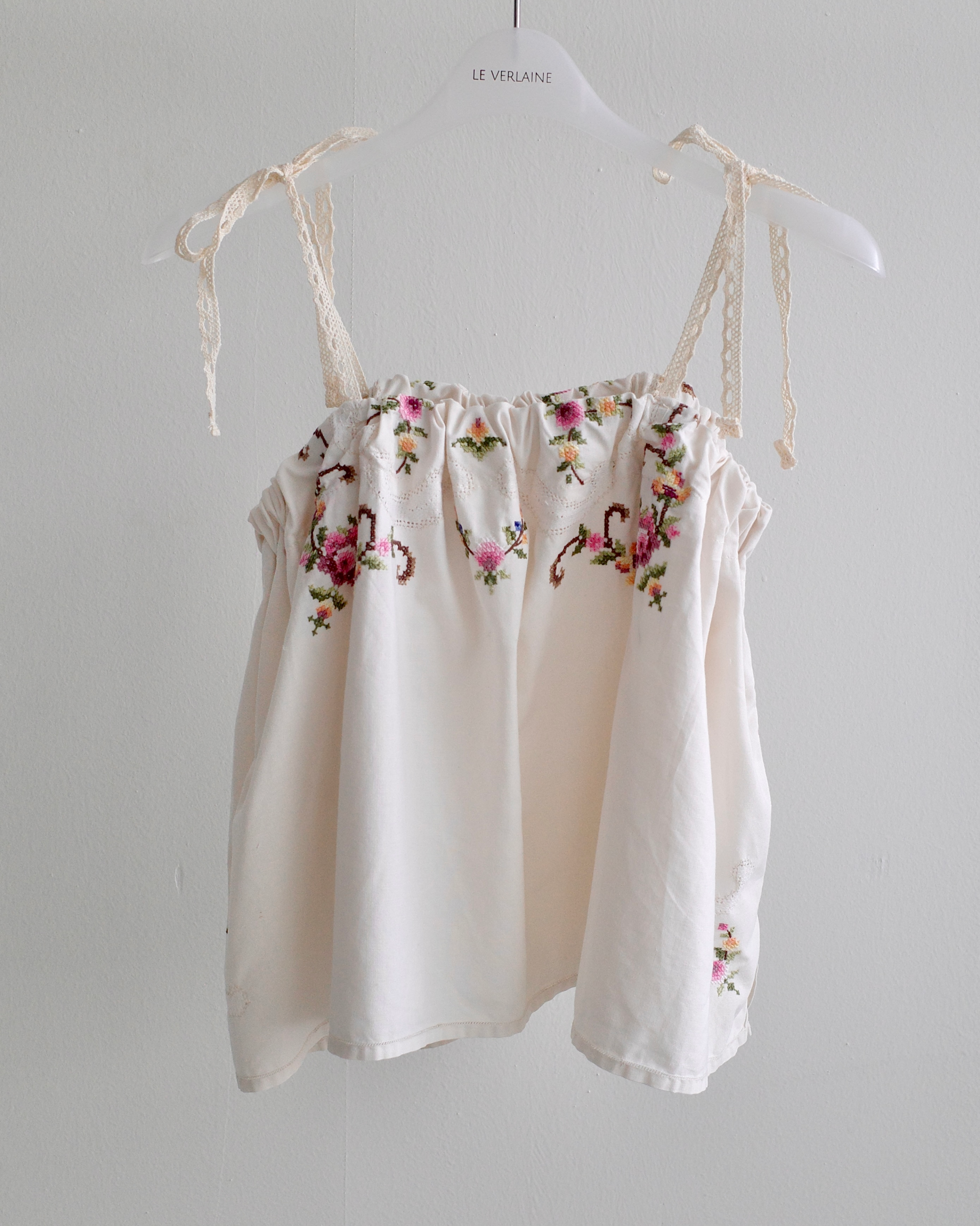 은은한 빈티지 플로럴 자수와 따뜻한 연베이지 톤이 어우러진 핸드메이드 탑입니다.