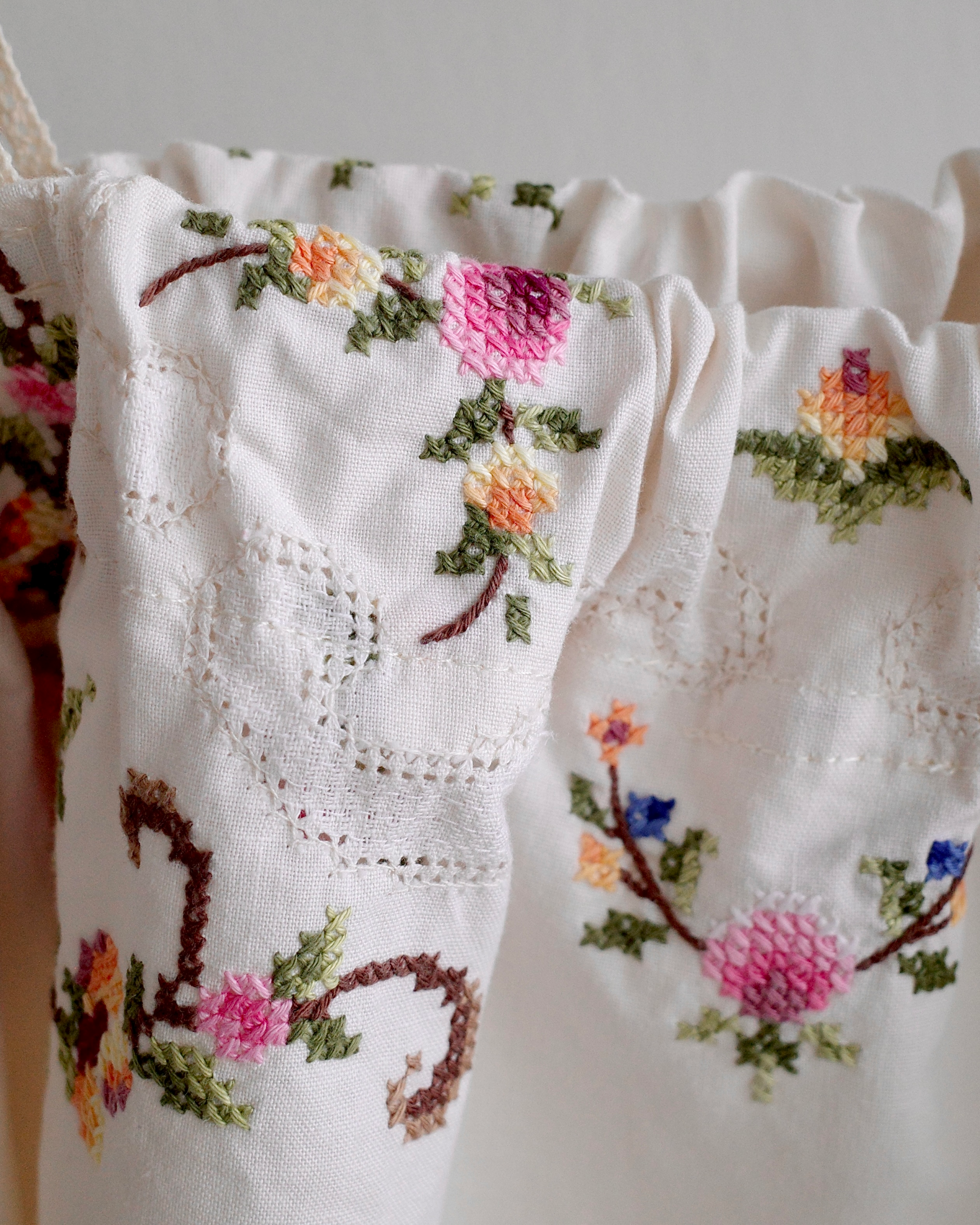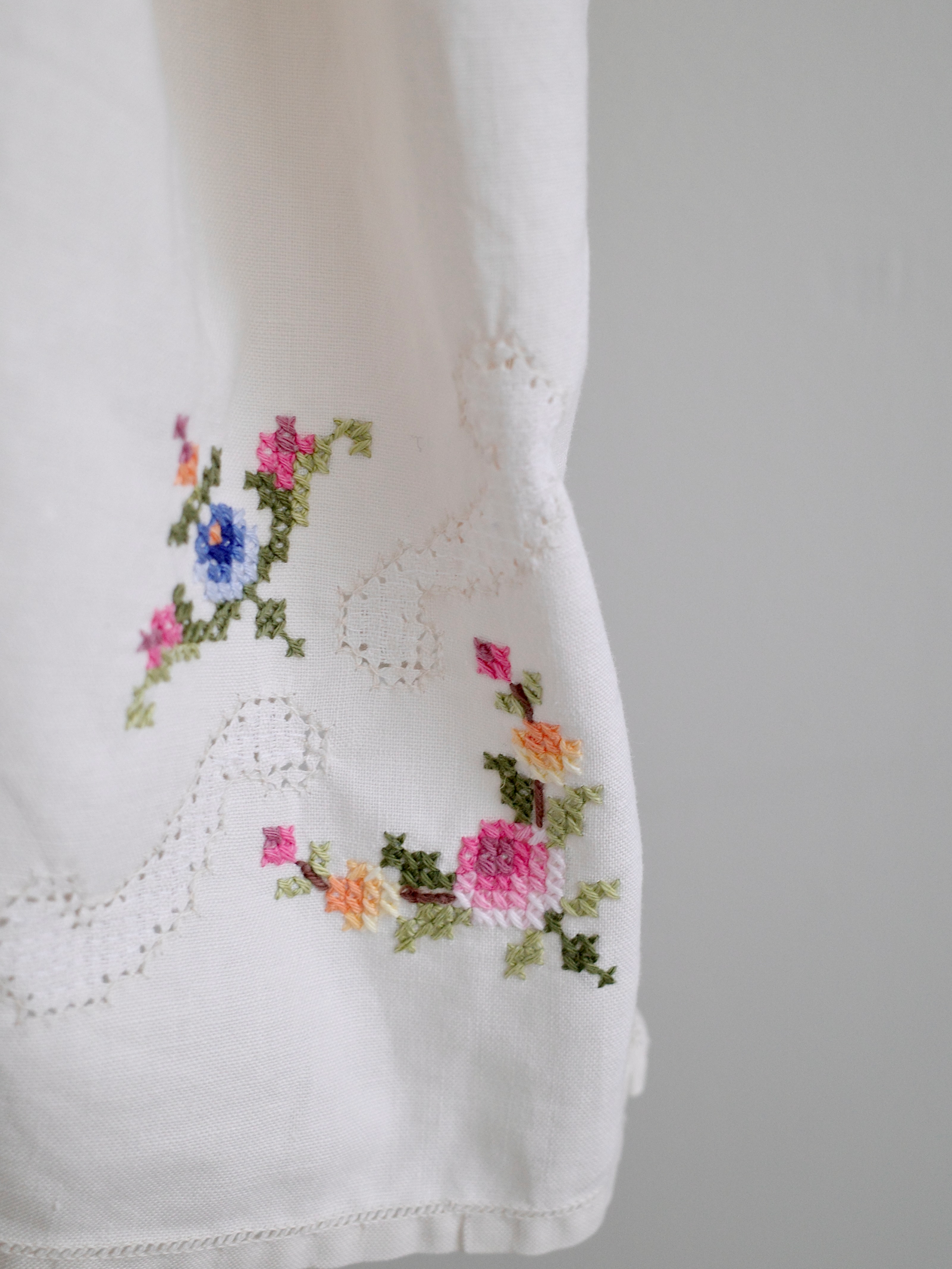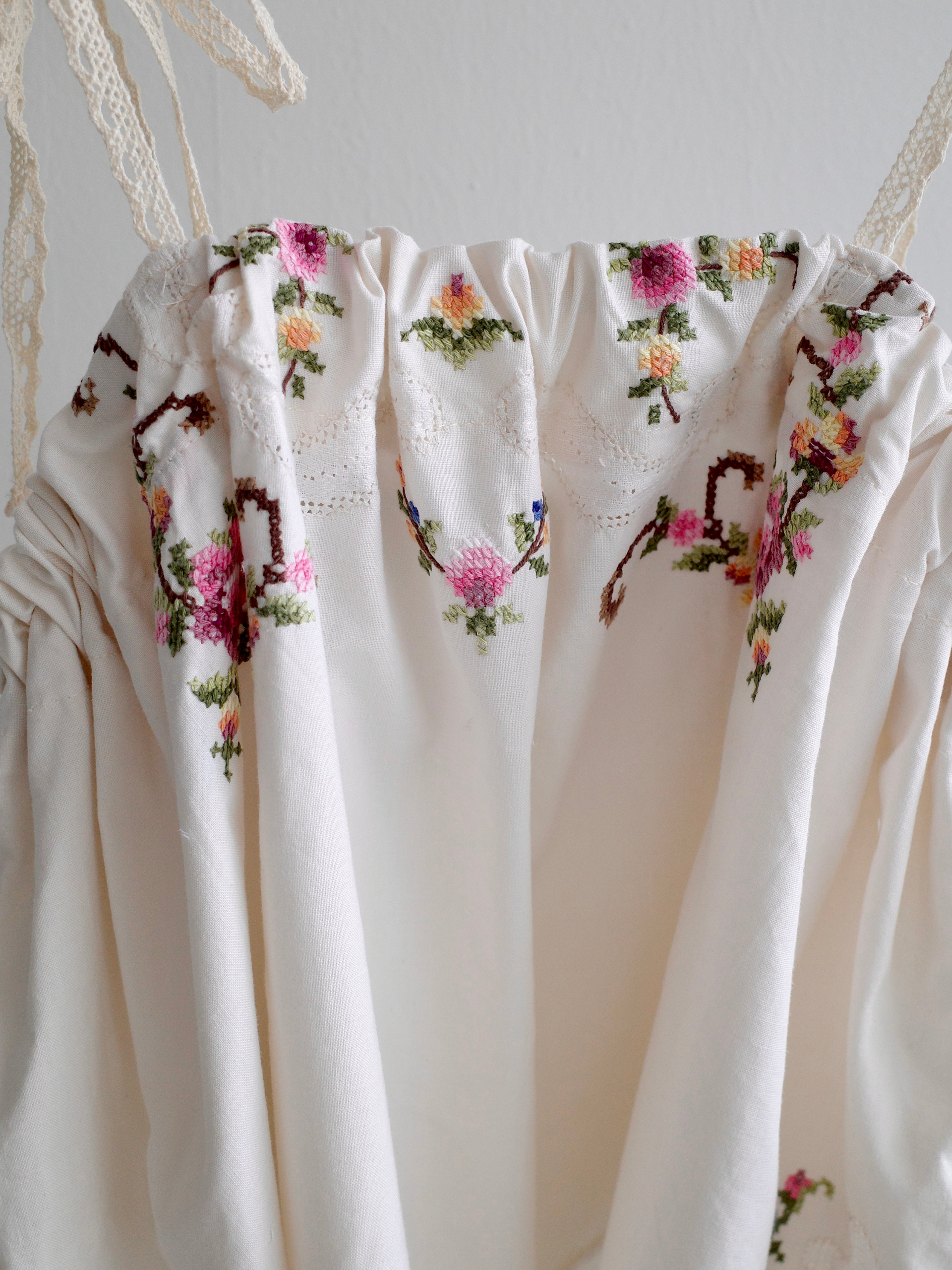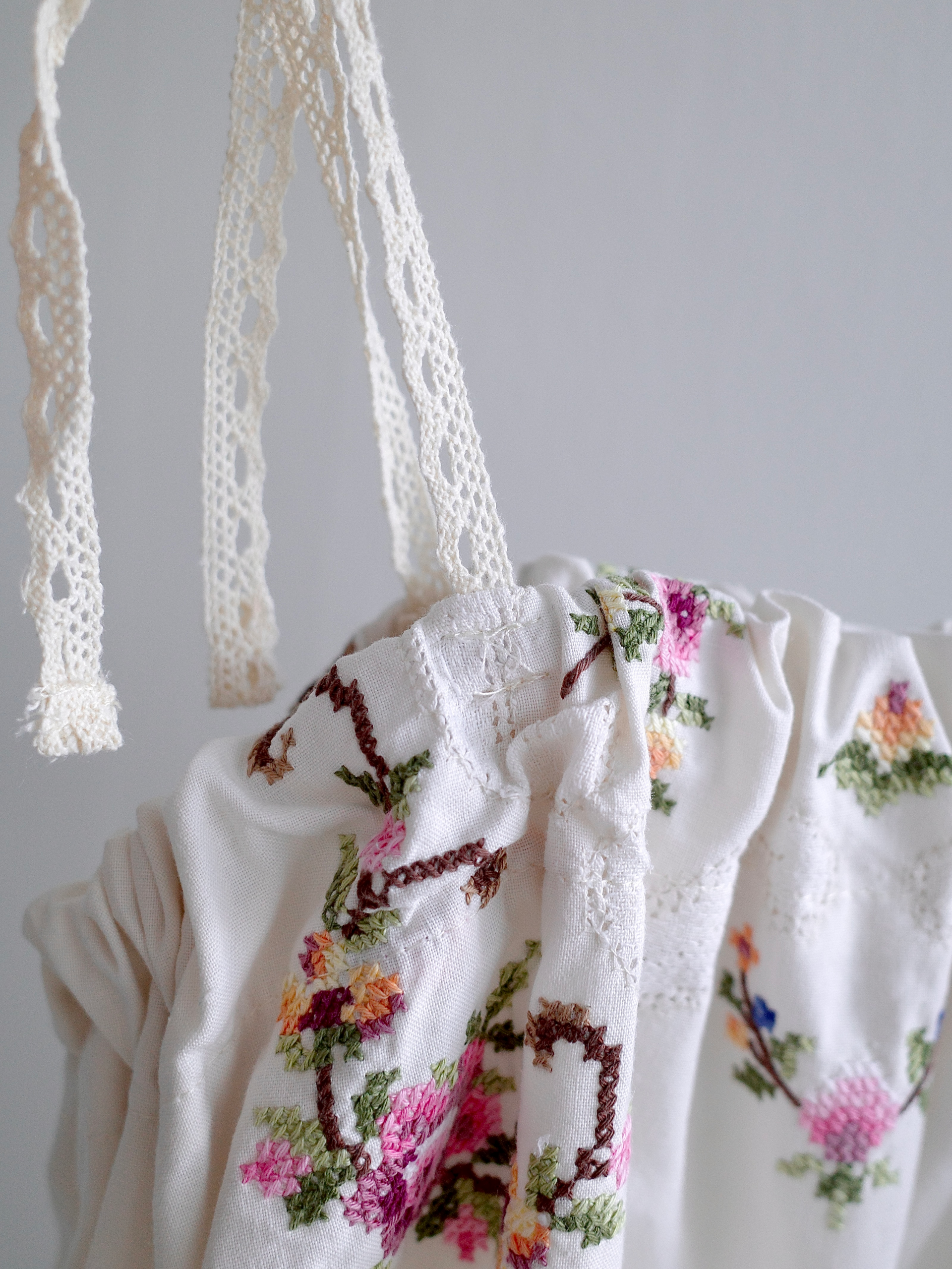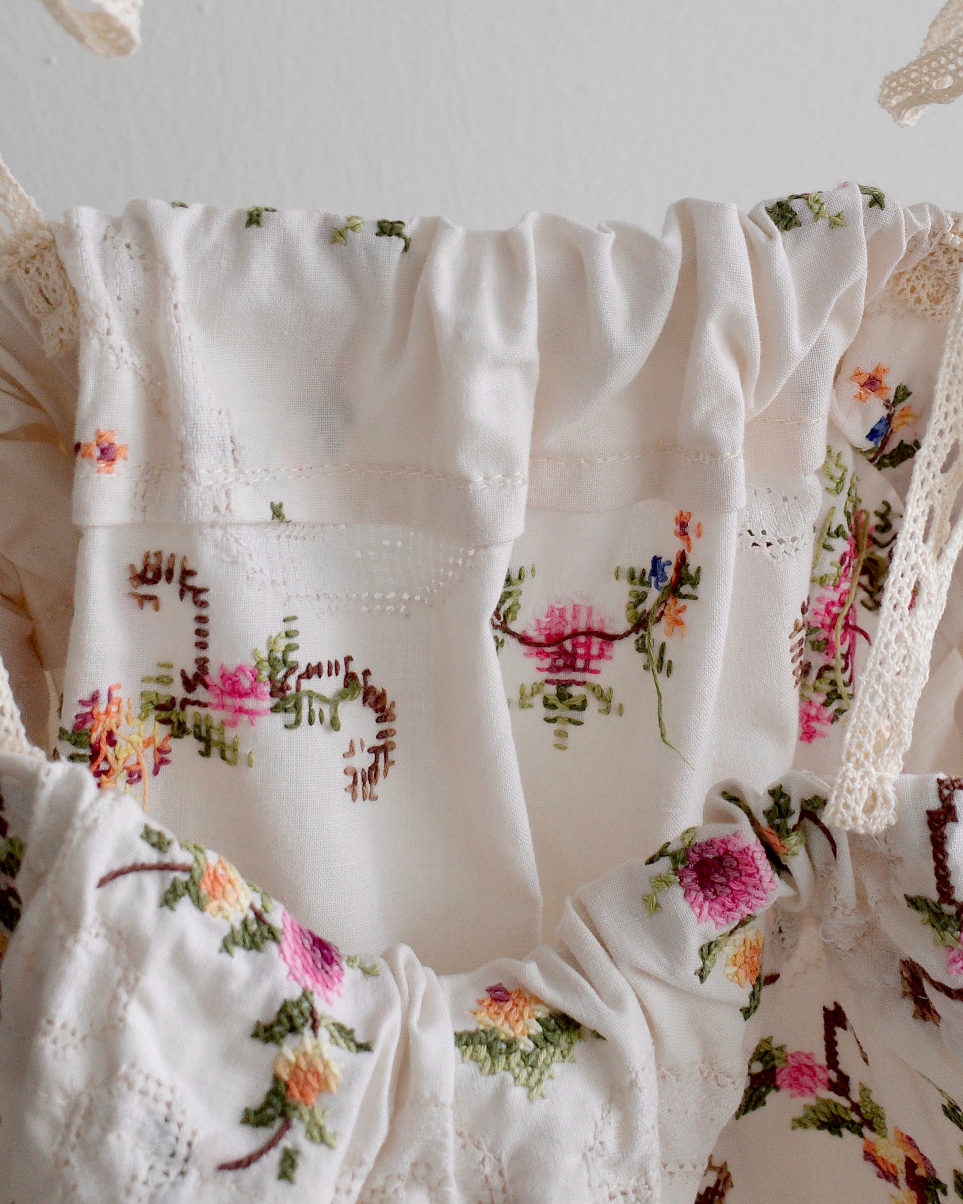 은은한 빈티지 플로럴 자수와 따뜻한 연베이지 톤이 어우러진 핸드메이드 탑입니다.
