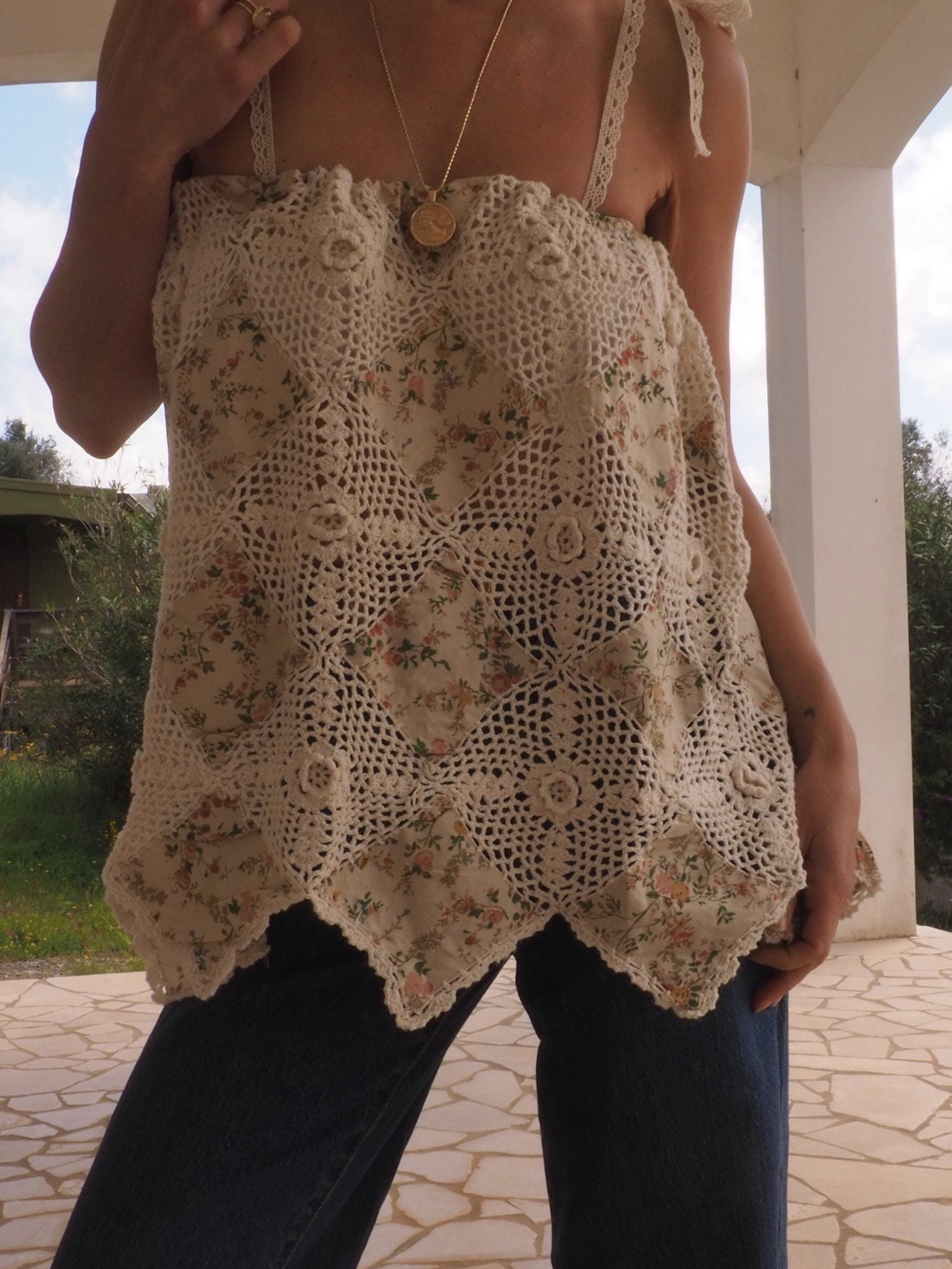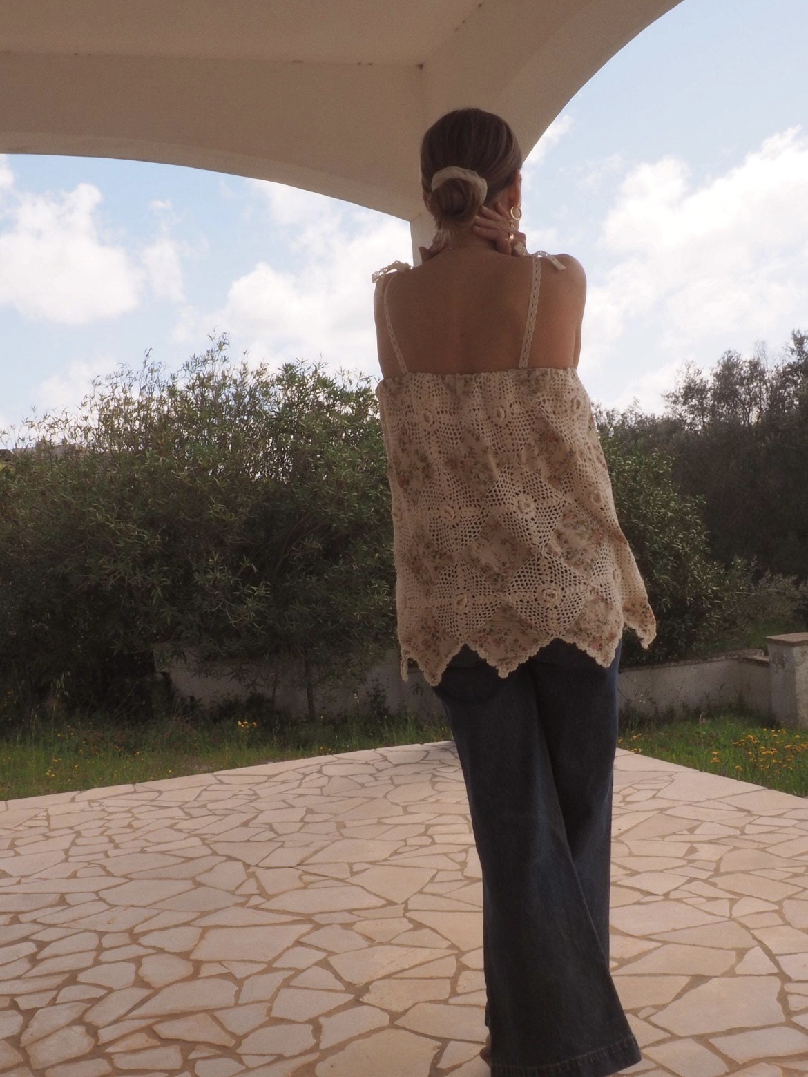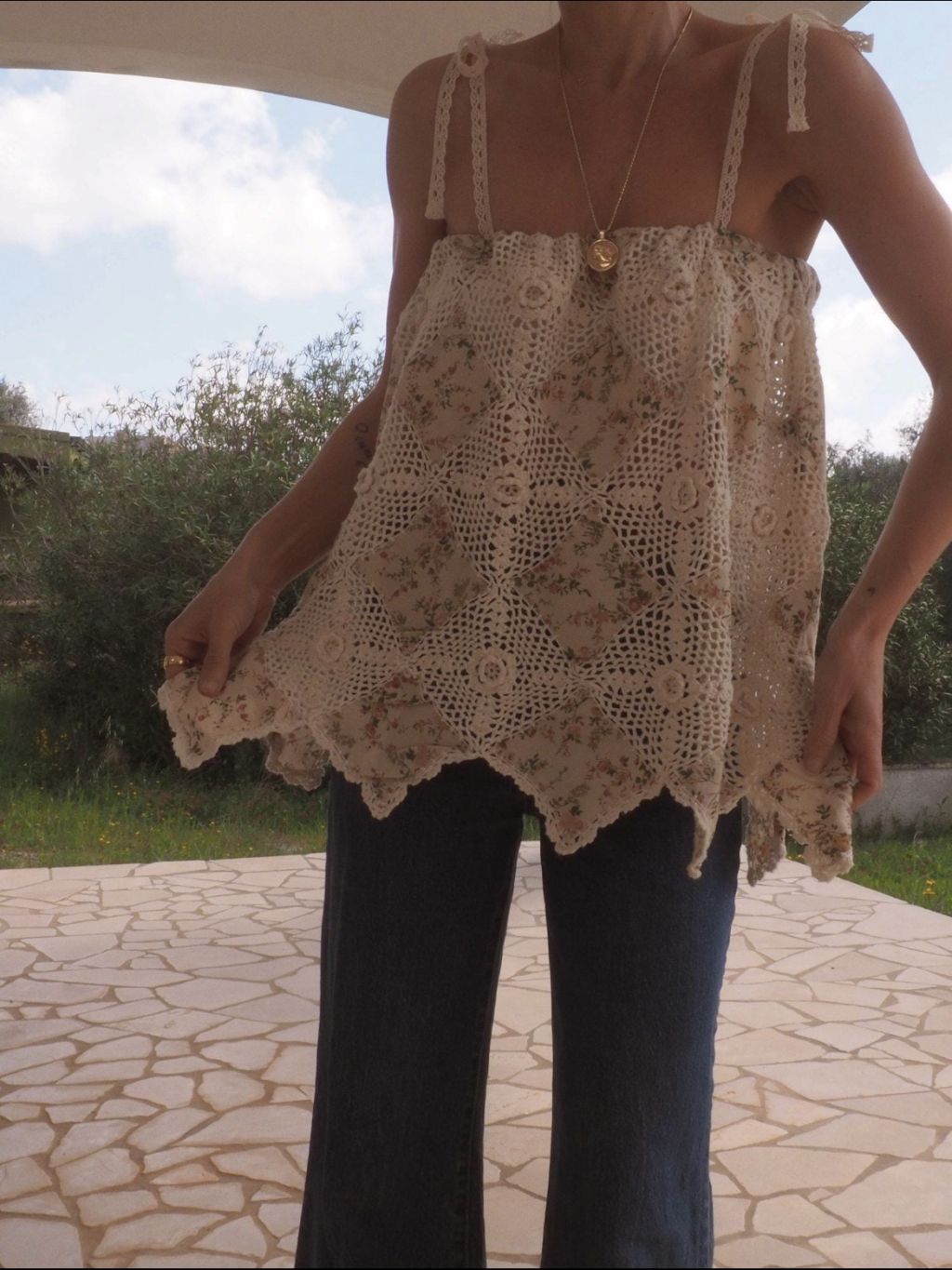 섬세한 이탈리아 자수 코튼 원단과 크로셰 레이스가 어우러진 탑입니다.