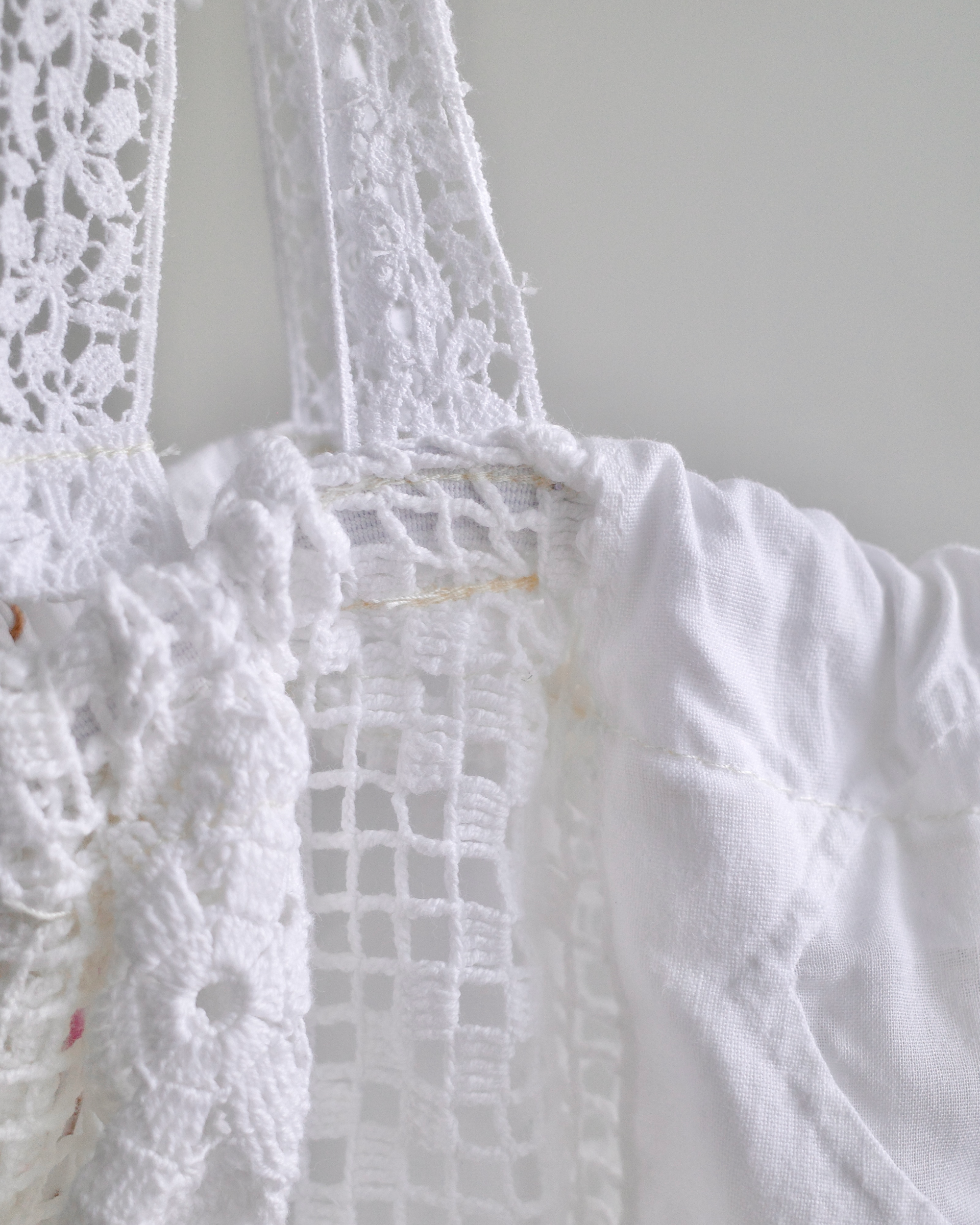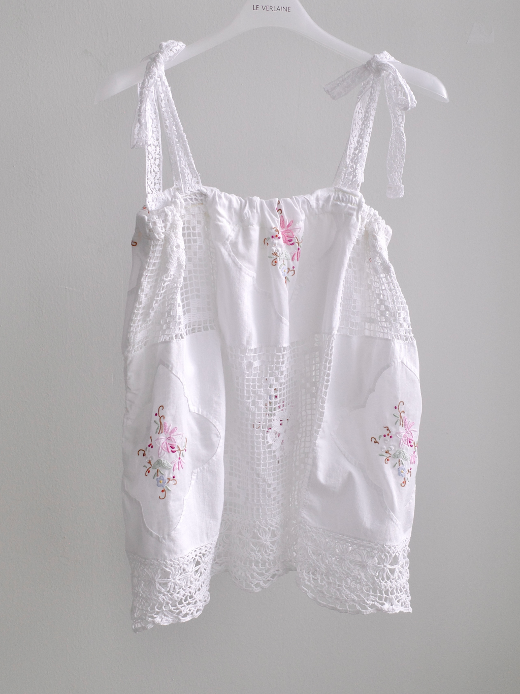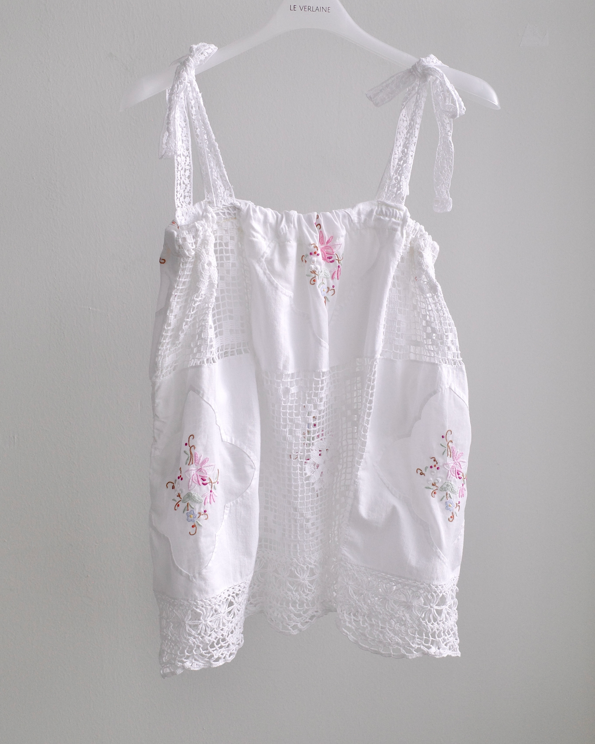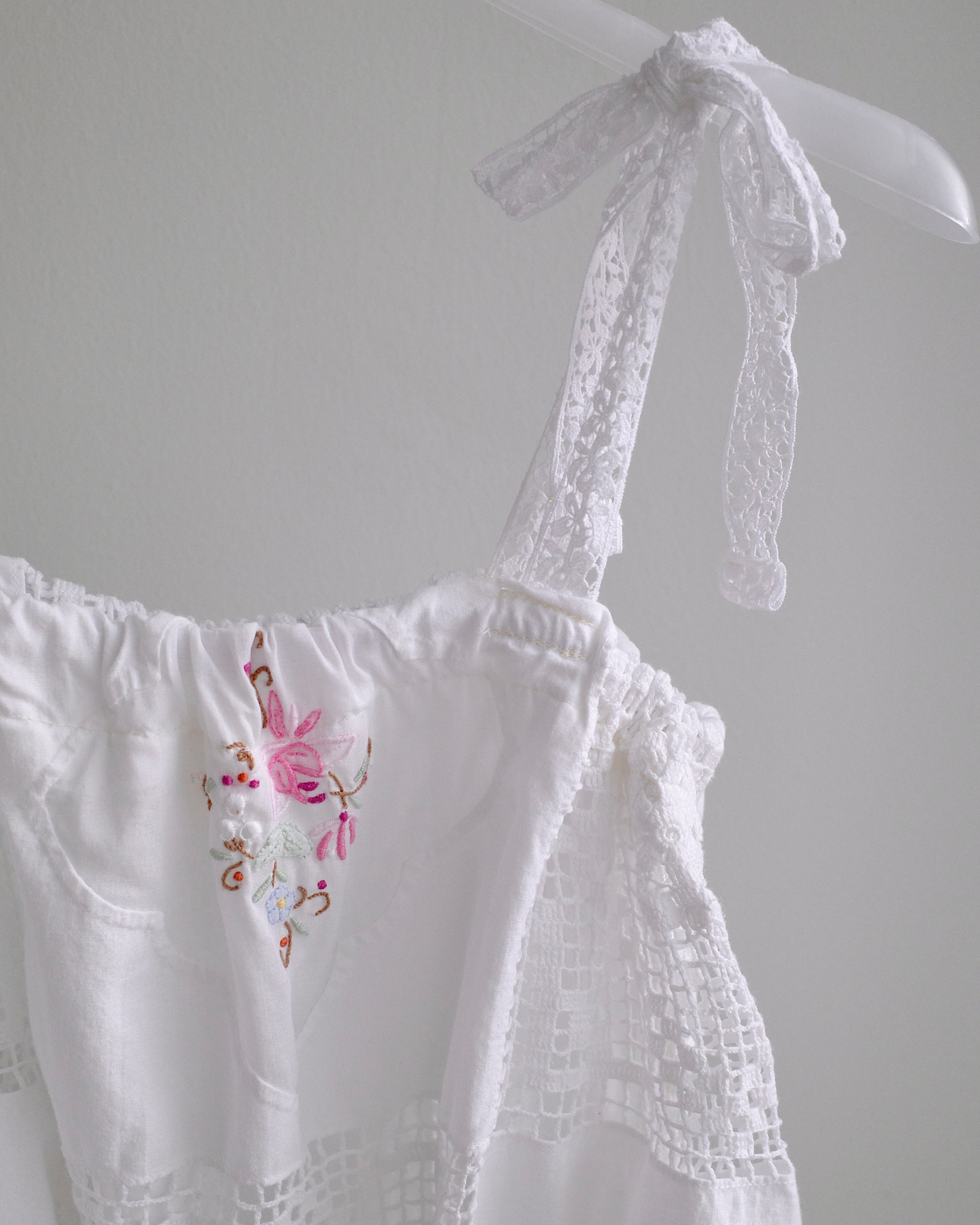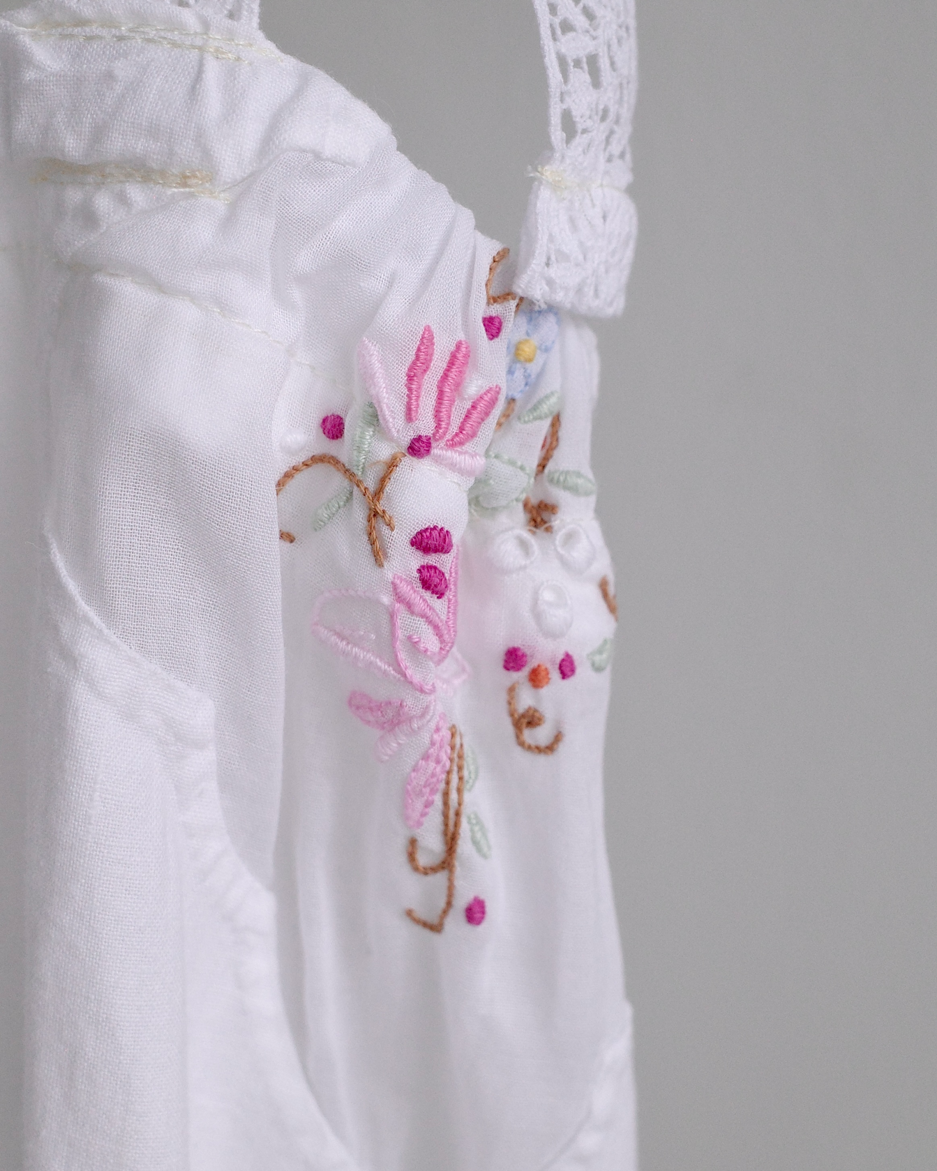 이탈리아 빈티지 자수 코튼과 크로셰 패브릭을 조합해 완성한 제품입니다. 섬세한 플라워 자수와 촘촘한 크로셰 디테일이 조화를 이루며, 고급스럽고 유니크한 빈티지 무드를 선사합니다. 어깨끈은 크로셰 스트랩으로 길이 조절 가능하며, 가슴라인은 전체 밴딩 처리되어 편안하게 착용하실 수 있습니다. 헴라인을 따라 이어지는 와이드 크로셰 디테일이 룩에 풍성한 볼륨감과 부드러운 실루엣을 더해줍니다.
