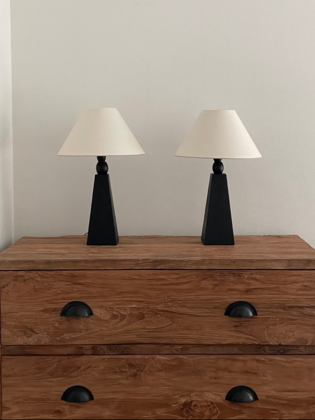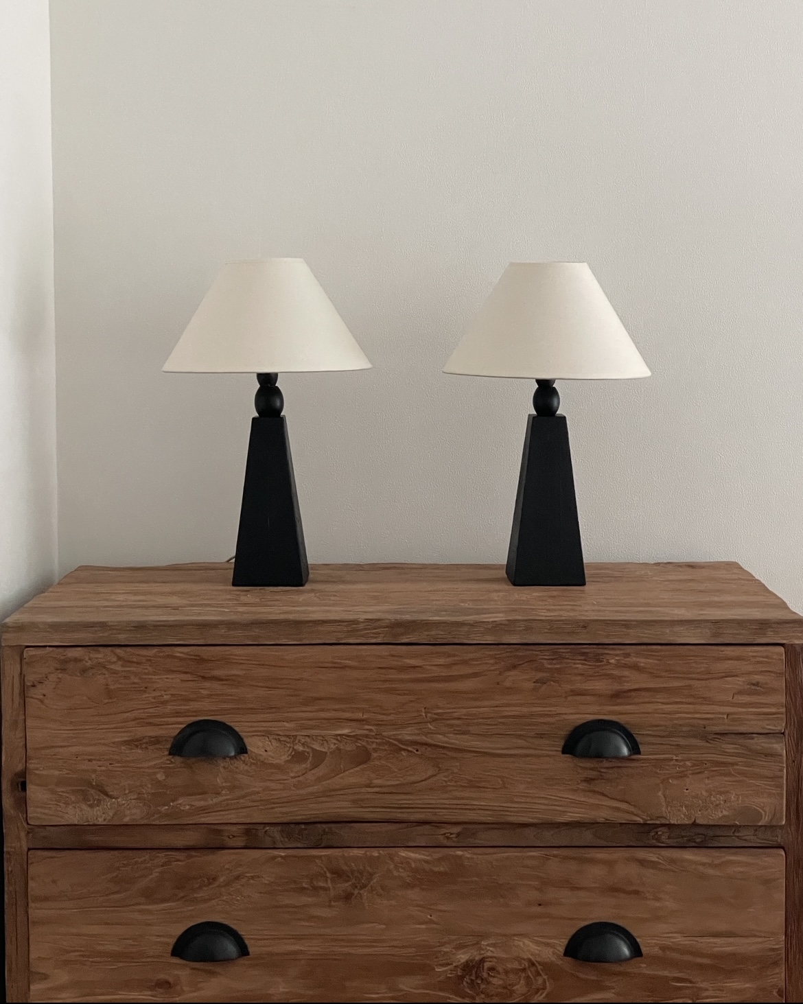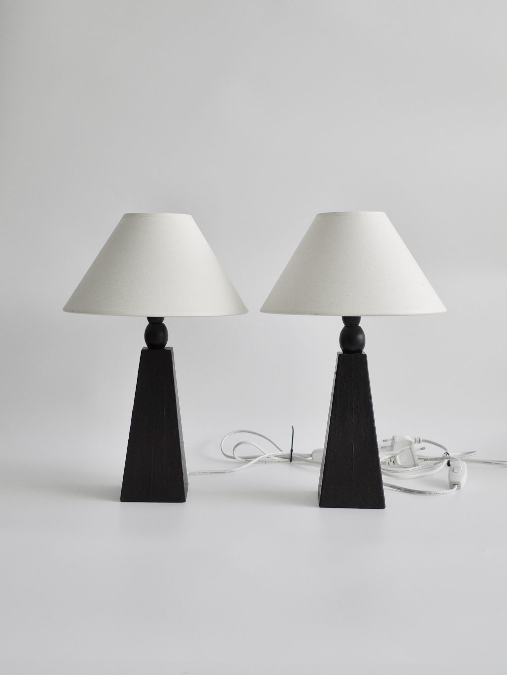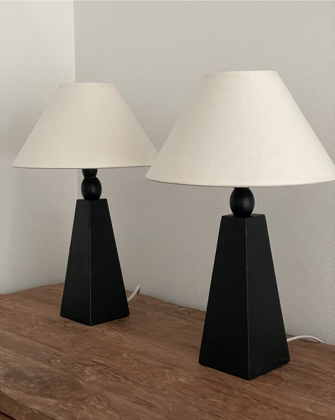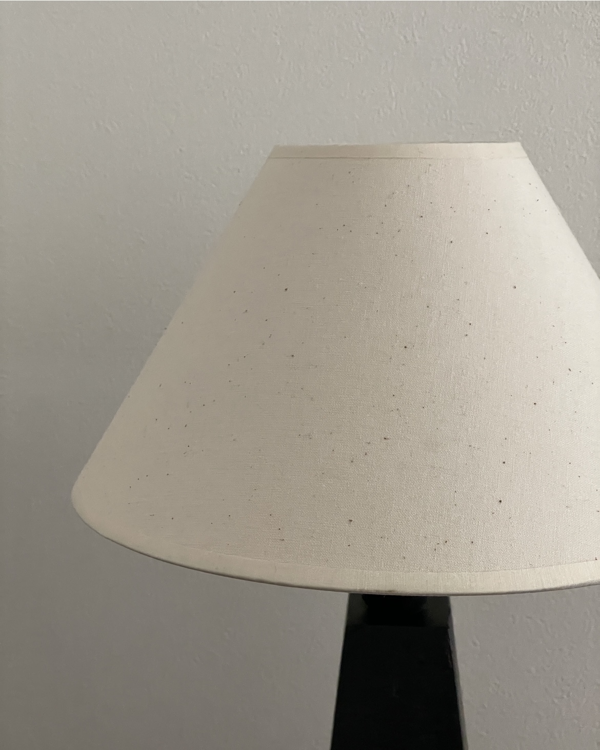 암스테르담에서 소싱된 제품으로, 블랙 래커 우드 베이스와 새로운 코튼 쉐이드가 조화를 이루며 절제된 조형미를 보여줍니다.
