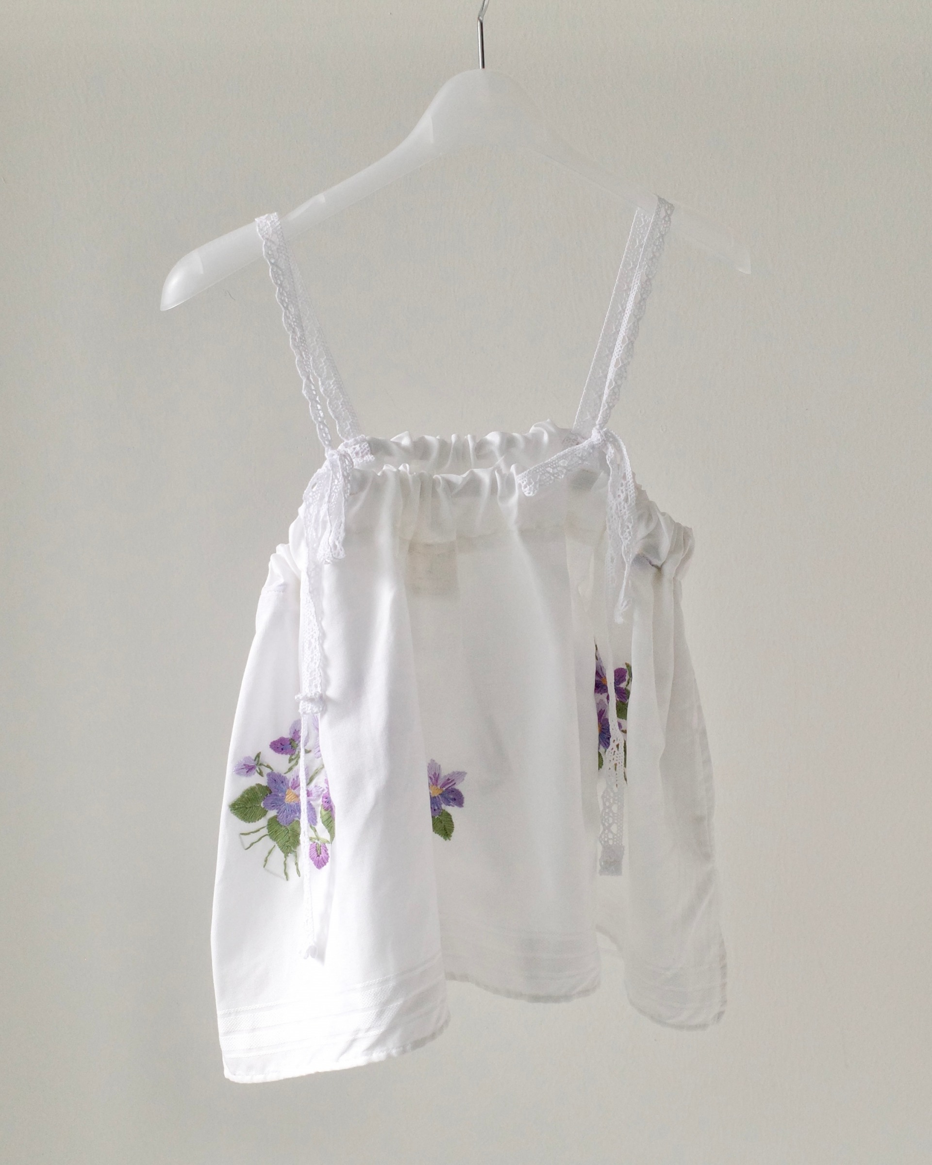 라일락 플로럴 자수가 새겨진 이탈리아 빈티지 코튼으로 제작된 탑입니다.