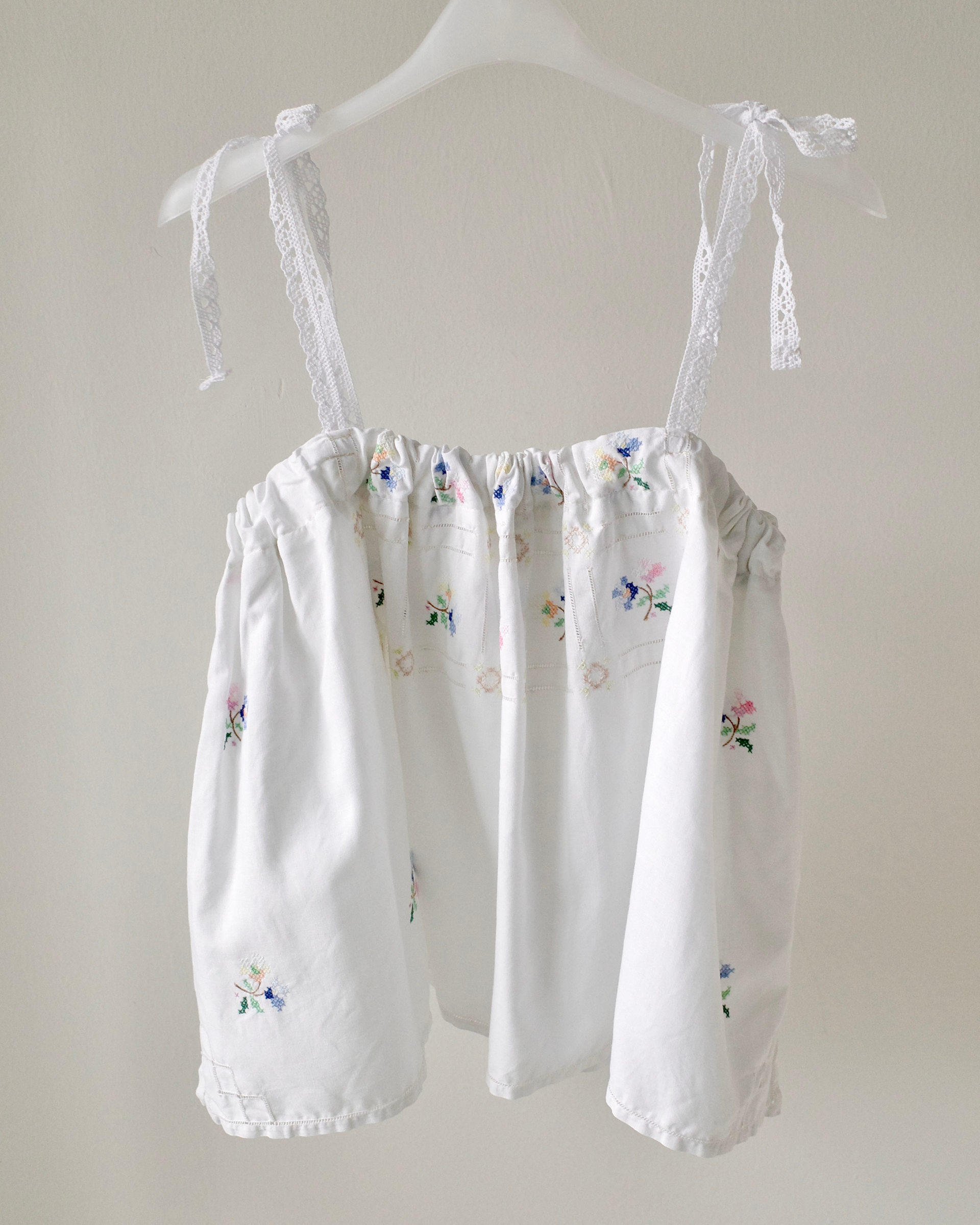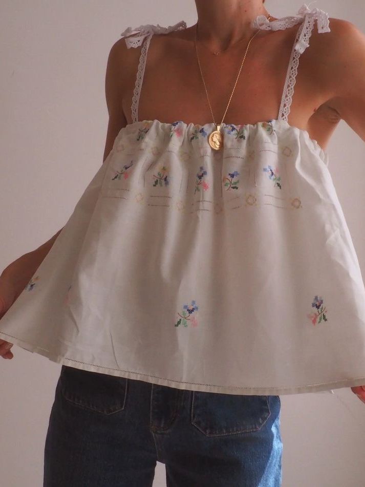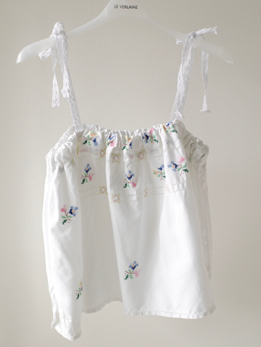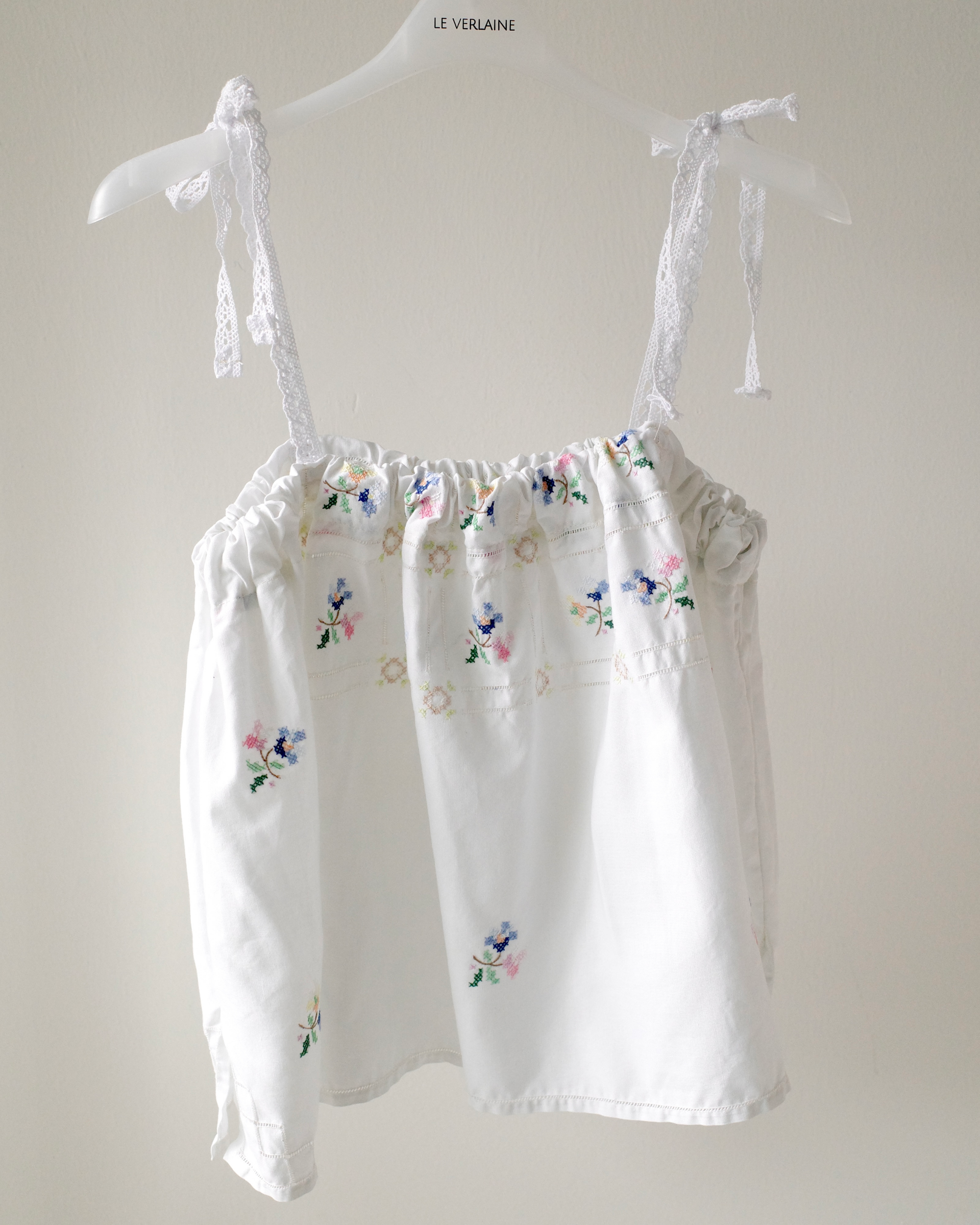 이탈리아 빈티지 코튼 원단 위에 파스텔 플로럴 모티프를 하나하나 섬세하게 수작업 자수로 수놓아 단 하나뿐인 매력을 지닌 탑입니다.