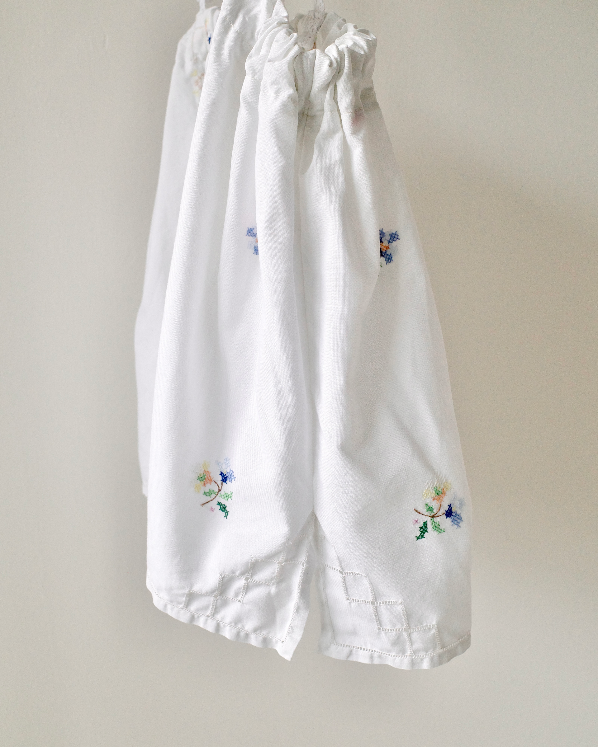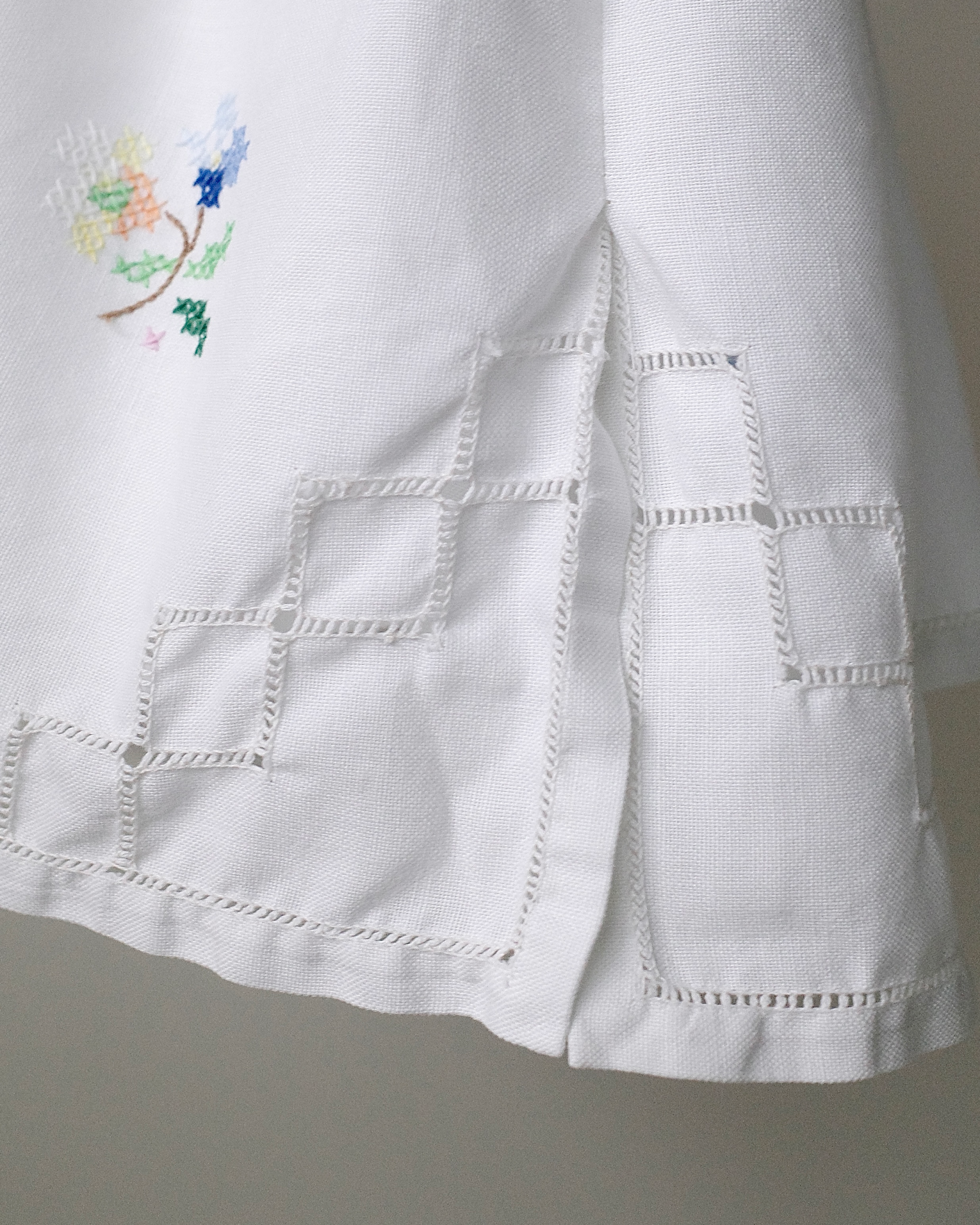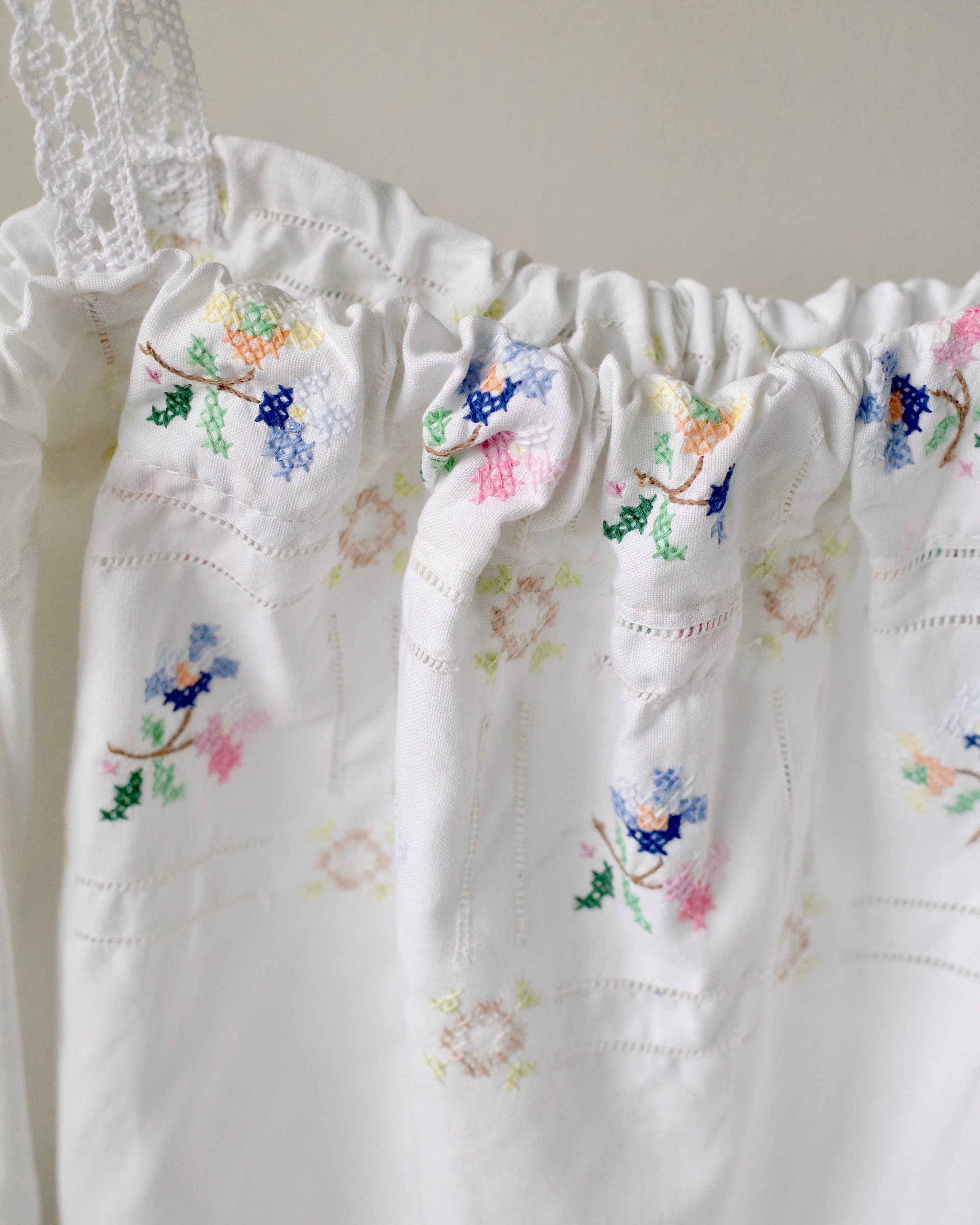 이탈리아 빈티지 코튼 원단 위에 파스텔 플로럴 모티프를 하나하나 섬세하게 수작업 자수로 수놓아 단 하나뿐인 매력을 지닌 탑입니다.