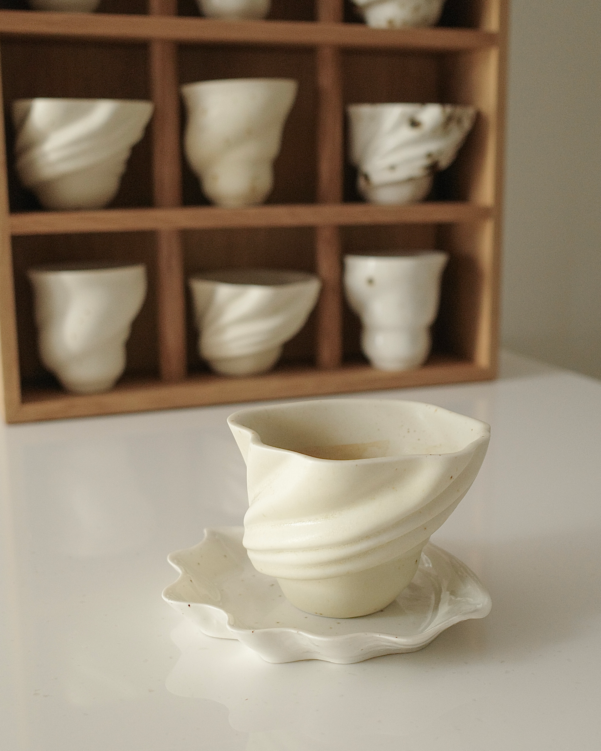 에그쉘 컬러는 백조 알을 닮은 은은하고 매트한 아이보리 톤으로, 유약 특유의 자연스러운 얼룩과 점들이 매력적입니다.