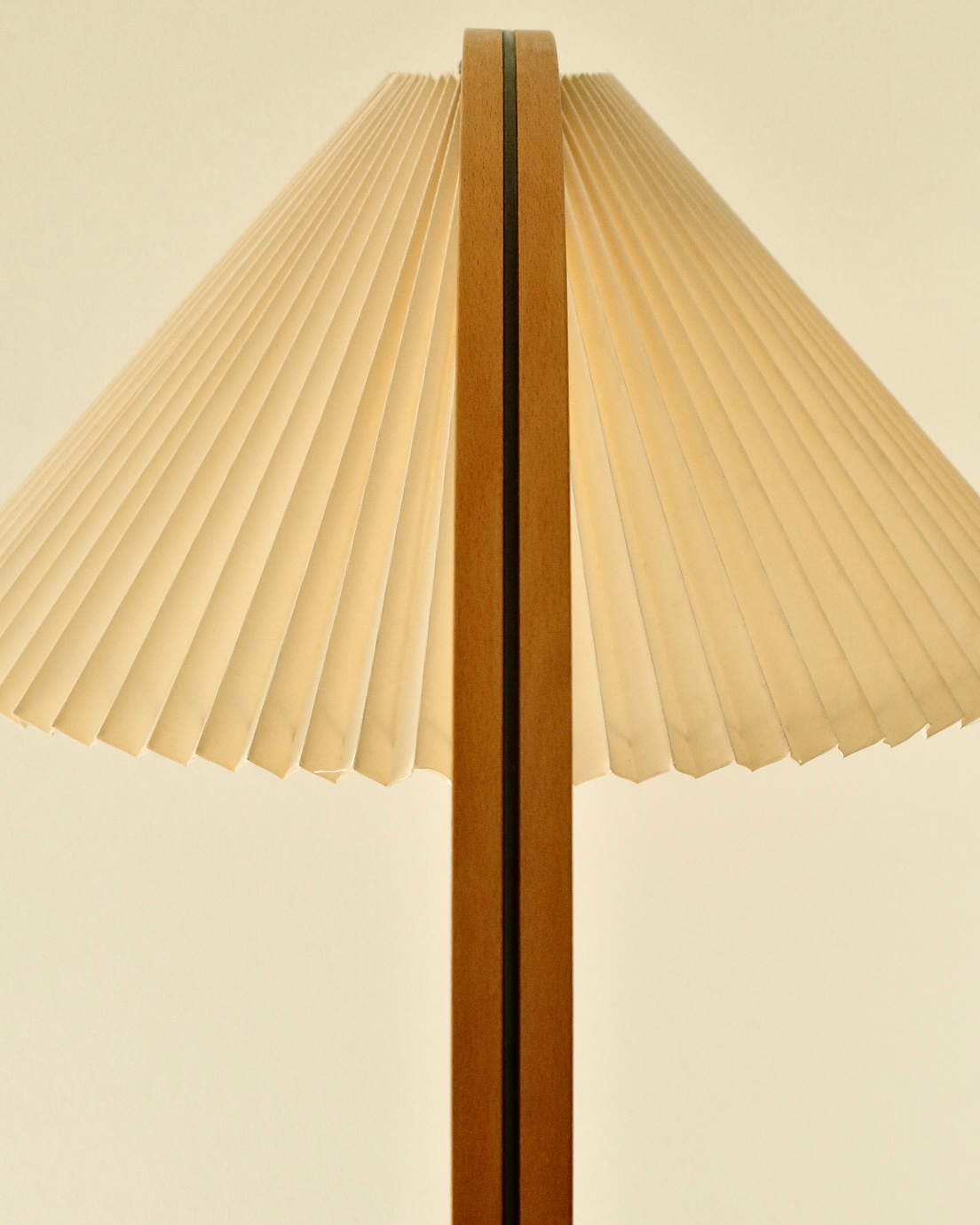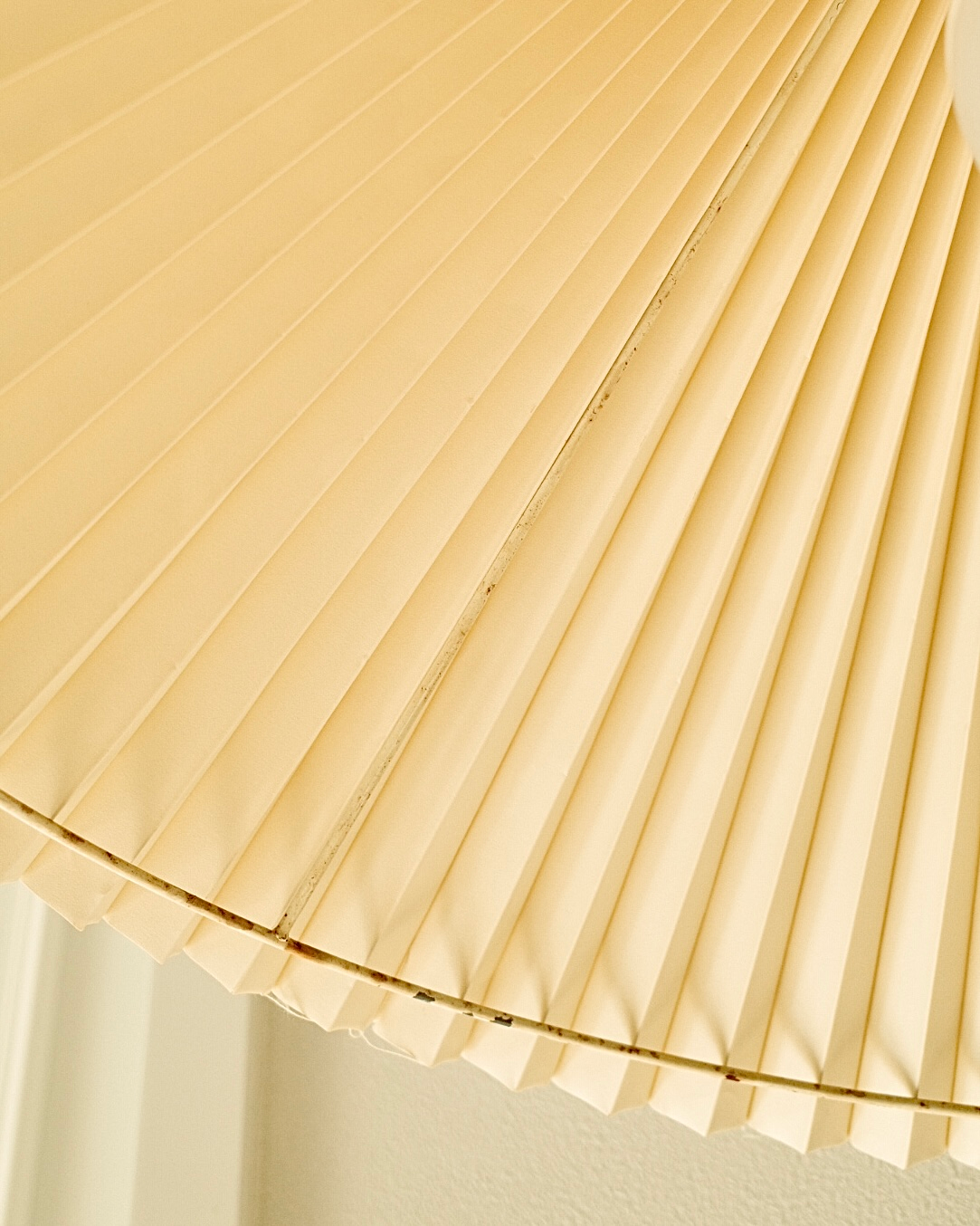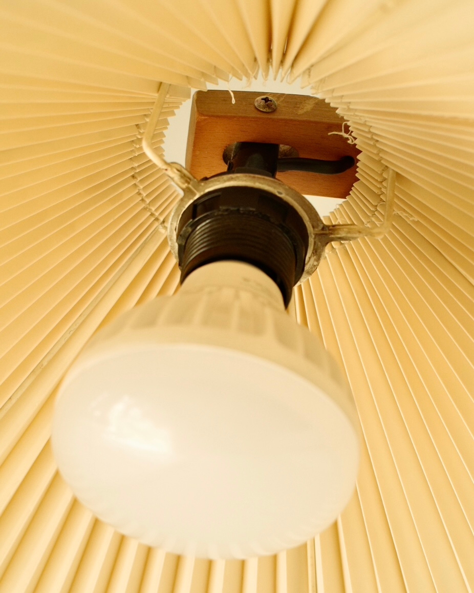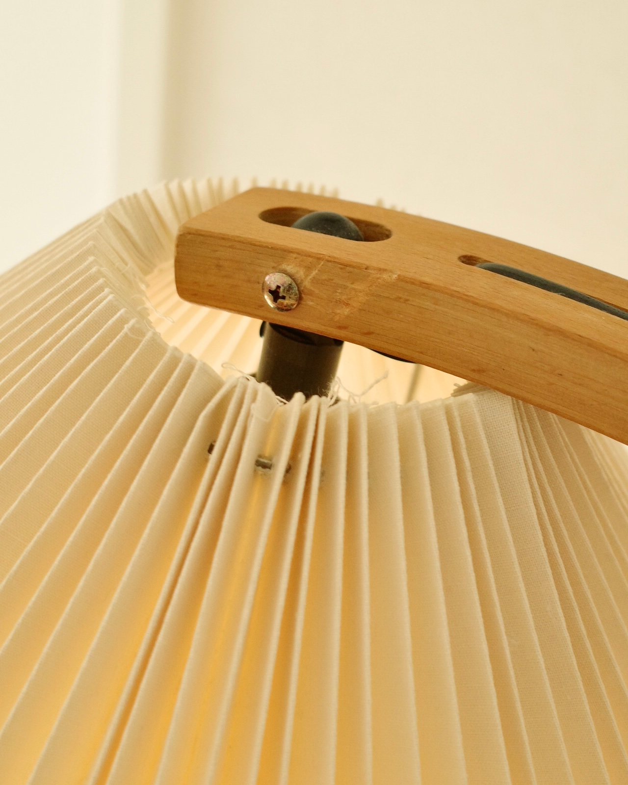 쉐이드는 내부에 형태를 잡아주는 종이 코어(Paper core)를 두고, 외부에 리넨 패브릭을 라미네이팅한 구조의 오리지널 플리츠 쉐이드로, 당시 Caprani Light AS에서 사용하던 정석적인 사양입니다.
