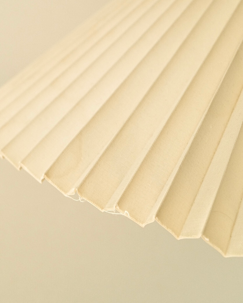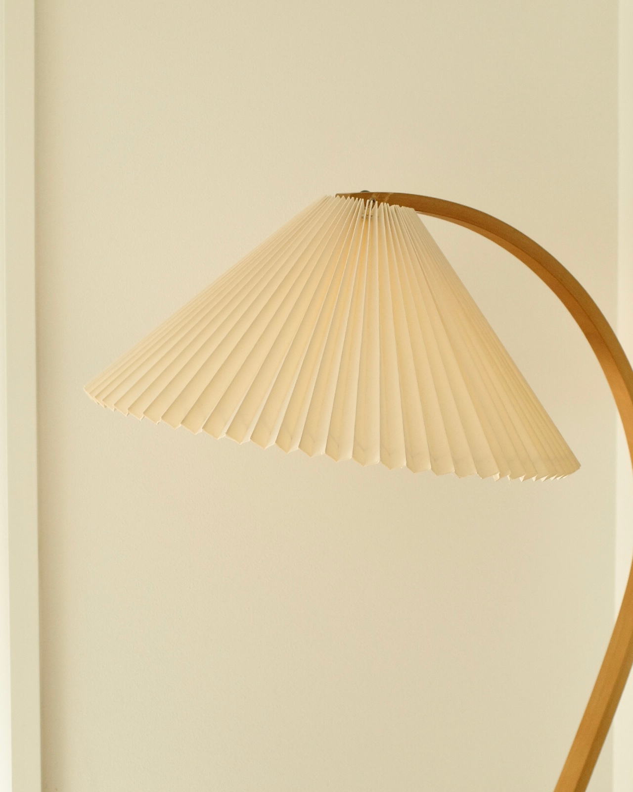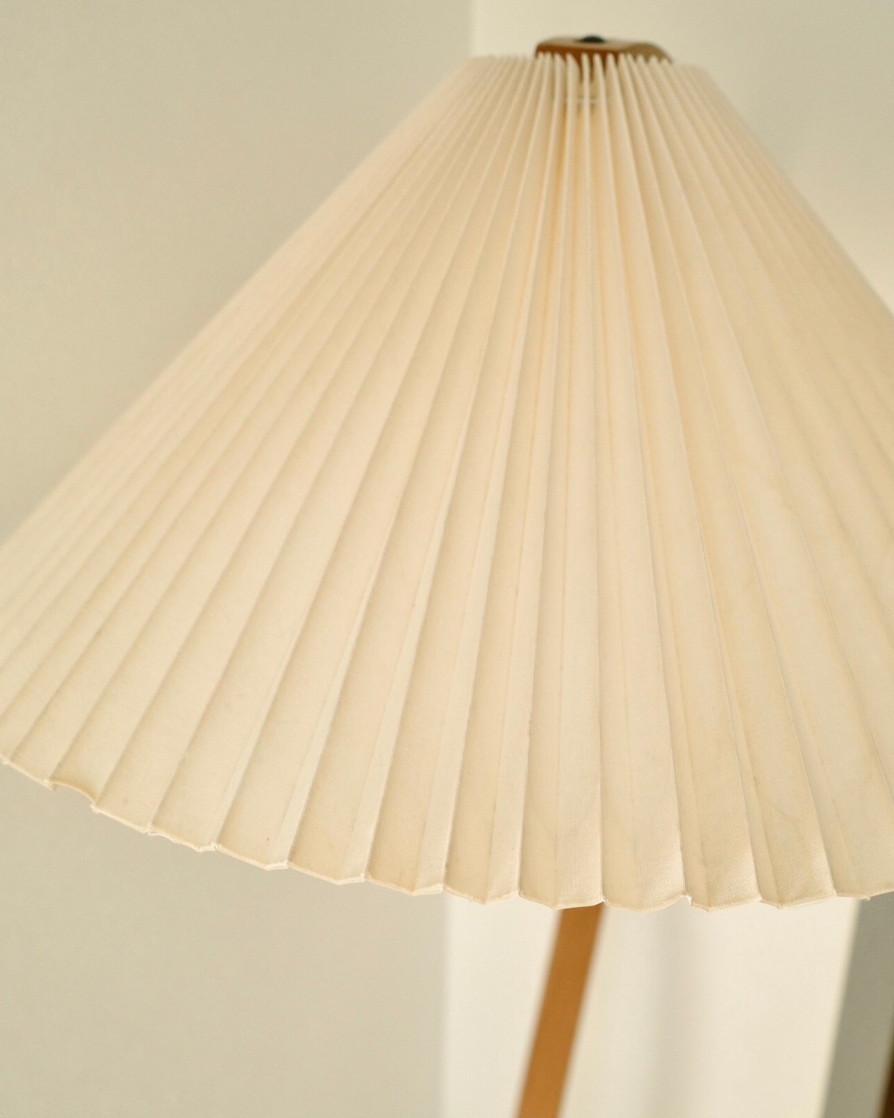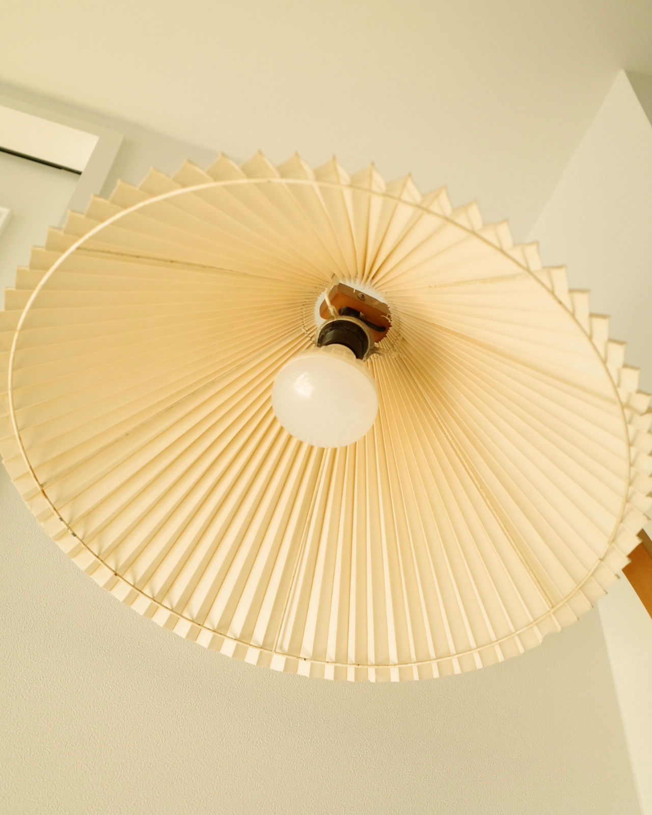 쉐이드는 내부에 형태를 잡아주는 종이 코어(Paper core)를 두고, 외부에 리넨 패브릭을 라미네이팅한 구조의 오리지널 플리츠 쉐이드로, 당시 Caprani Light AS에서 사용하던 정석적인 사양입니다.