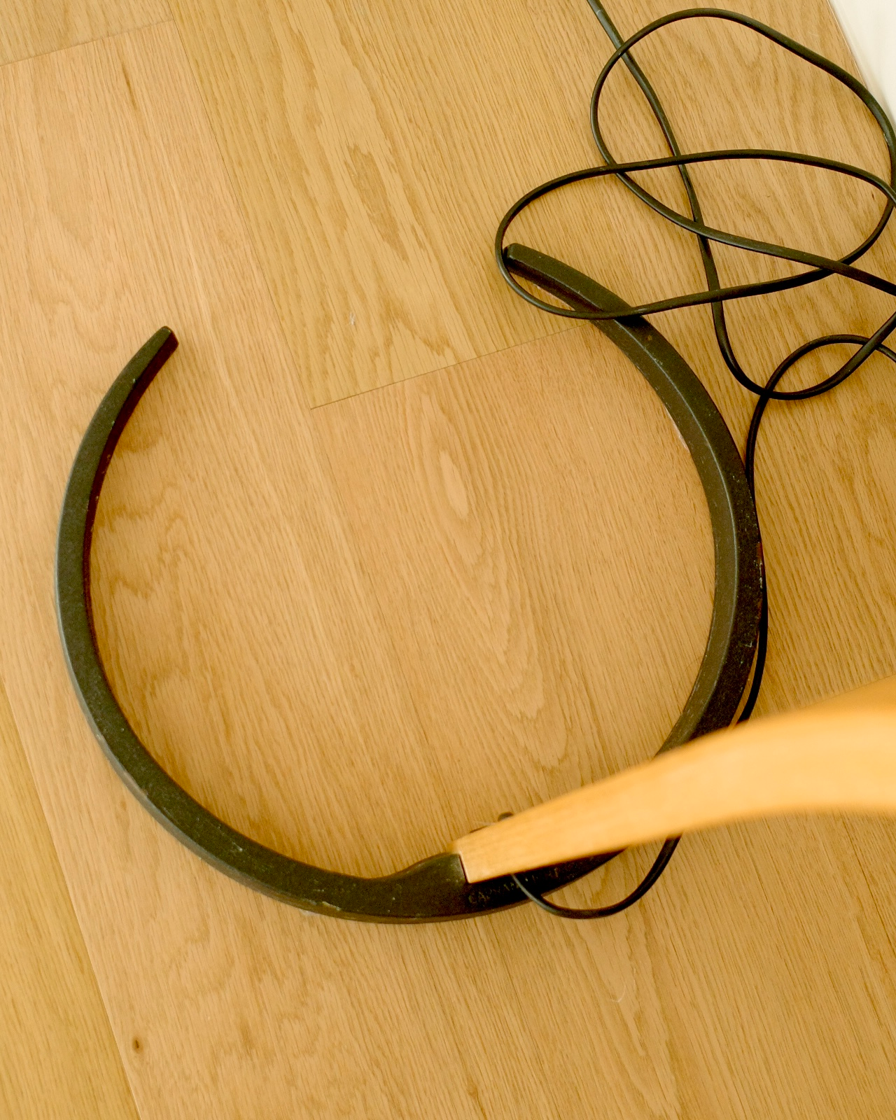 Timberline No.840은 자연스럽게 휘어진 원목 스템과 반달 형태의 묵직한 주철 베이스, 그리고 플리츠 쉐이드의 조합이 특징입니다.