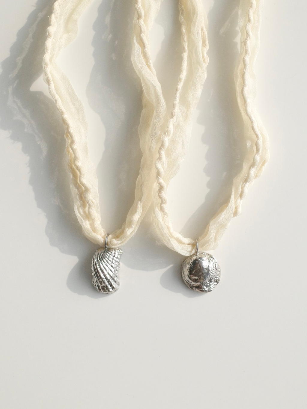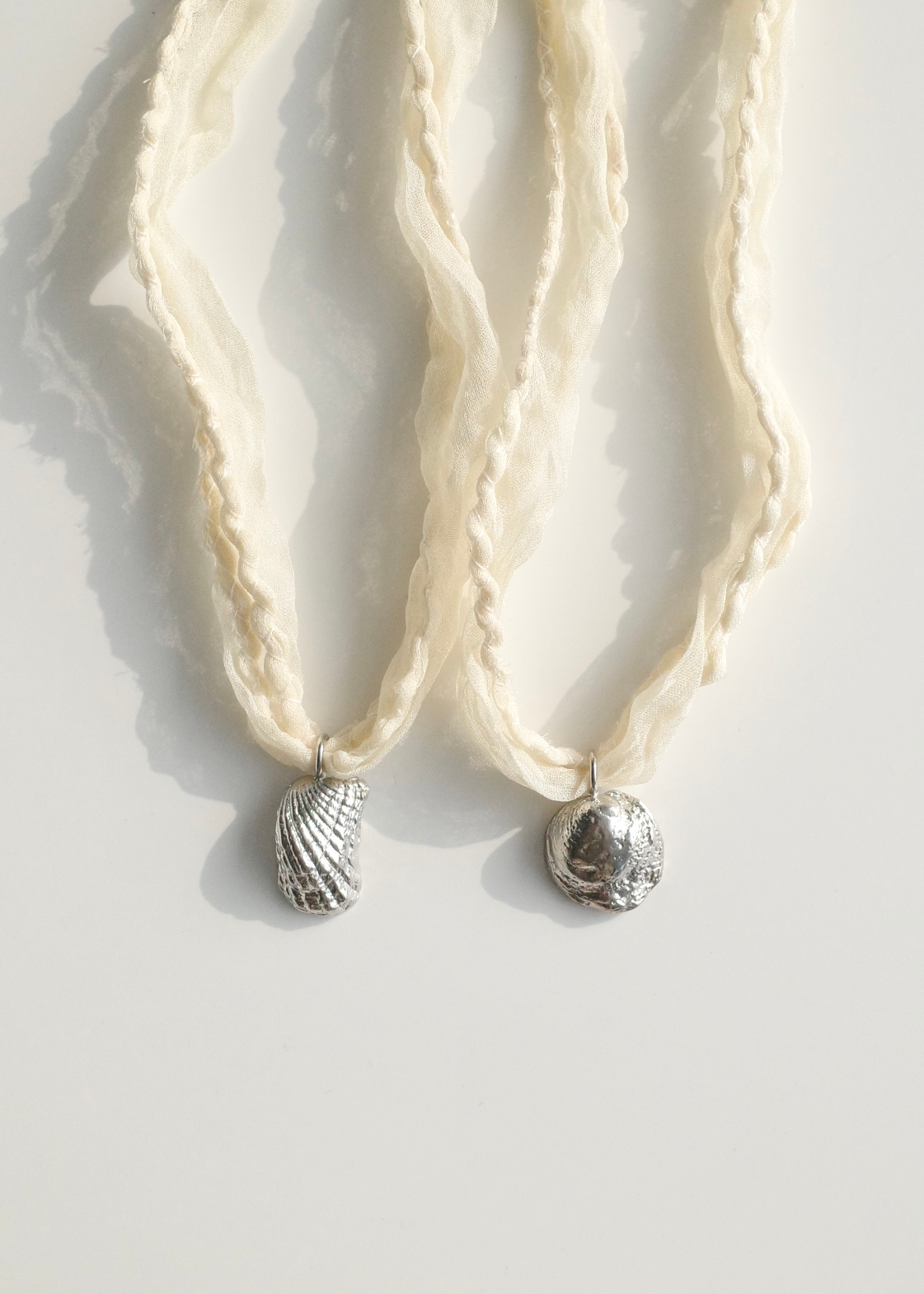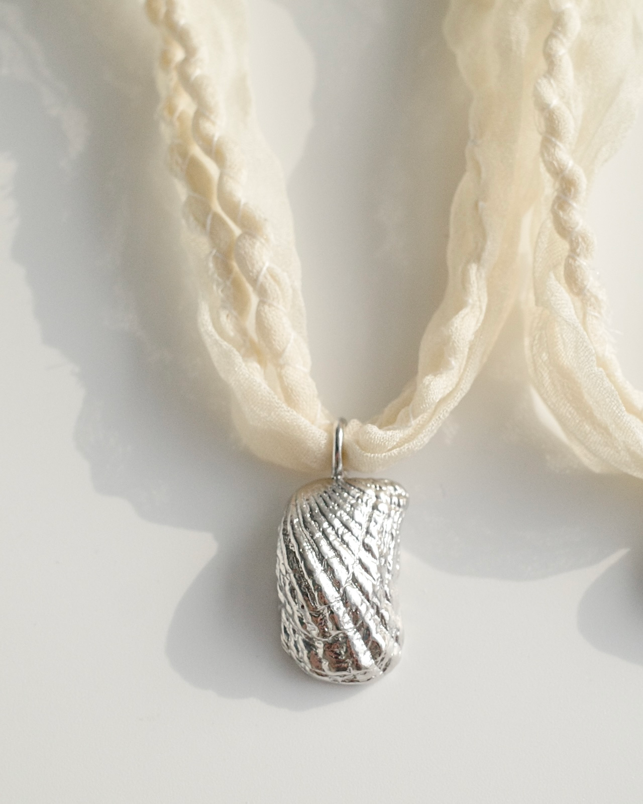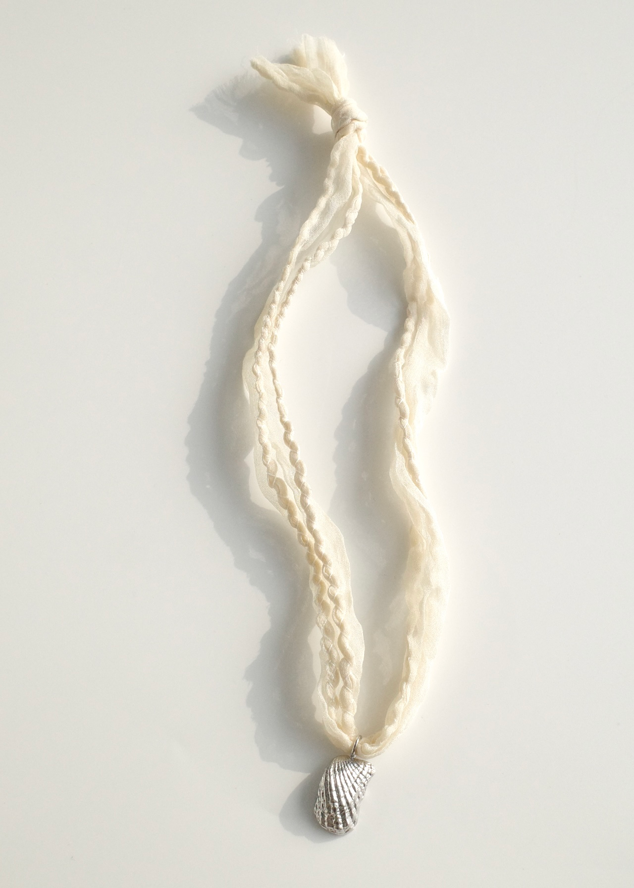 조개의 형태를 황동으로 담아내고, 얇은 새틴 실크 원단을 말아 바느질한 스트랩으로 마무리했습니다.