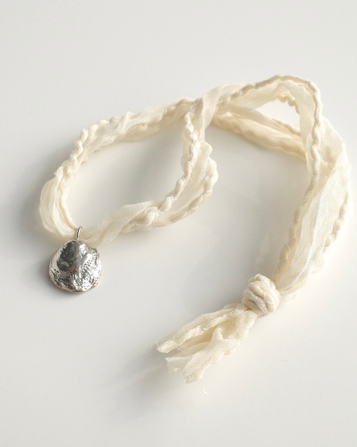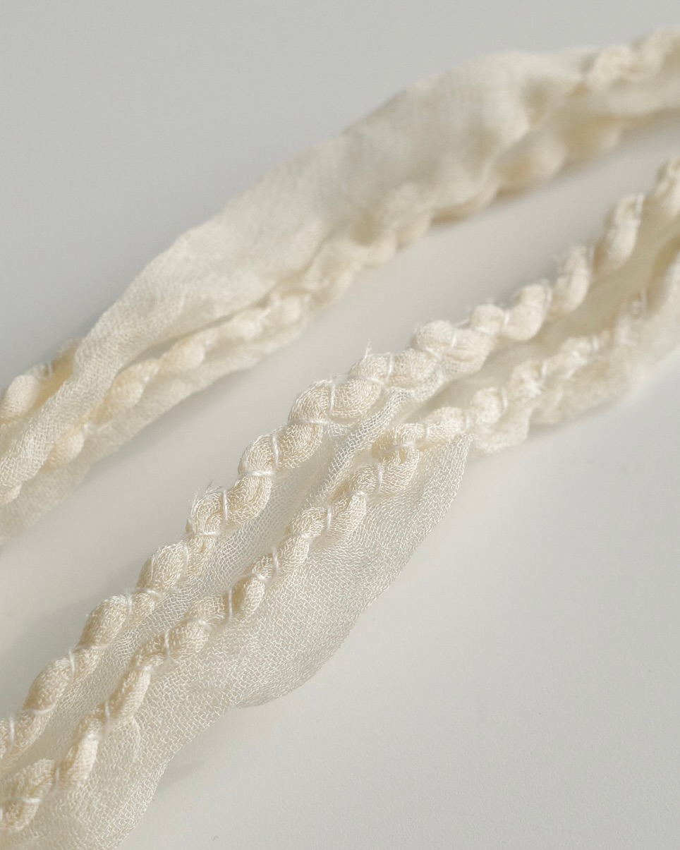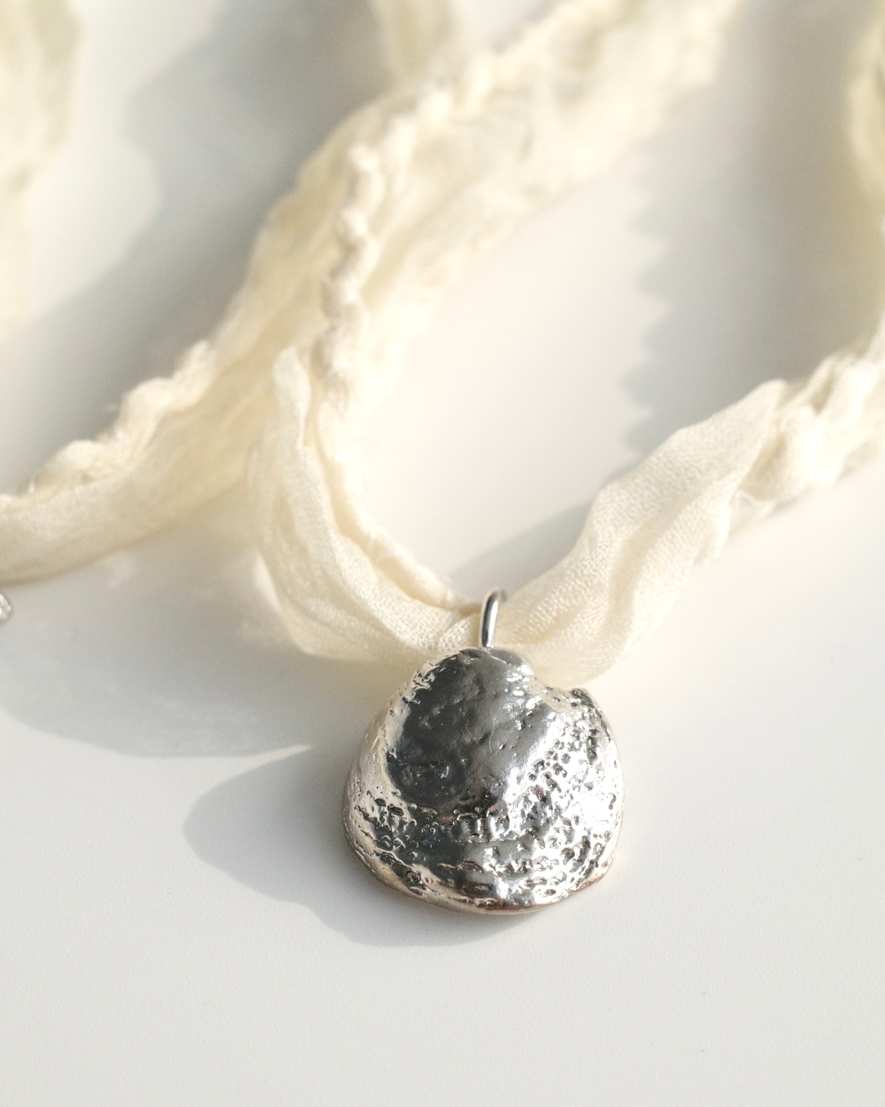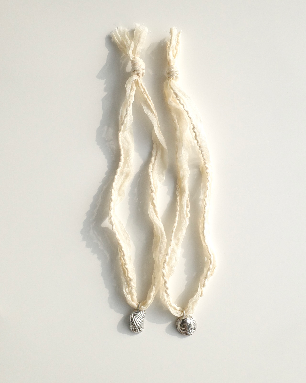 조개의 형태를 황동으로 담아내고, 얇은 새틴 실크 원단을 말아 바느질한 스트랩으로 마무리했습니다.