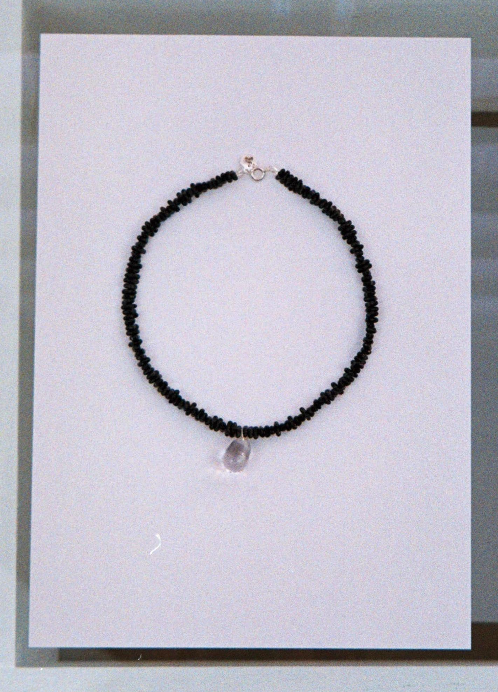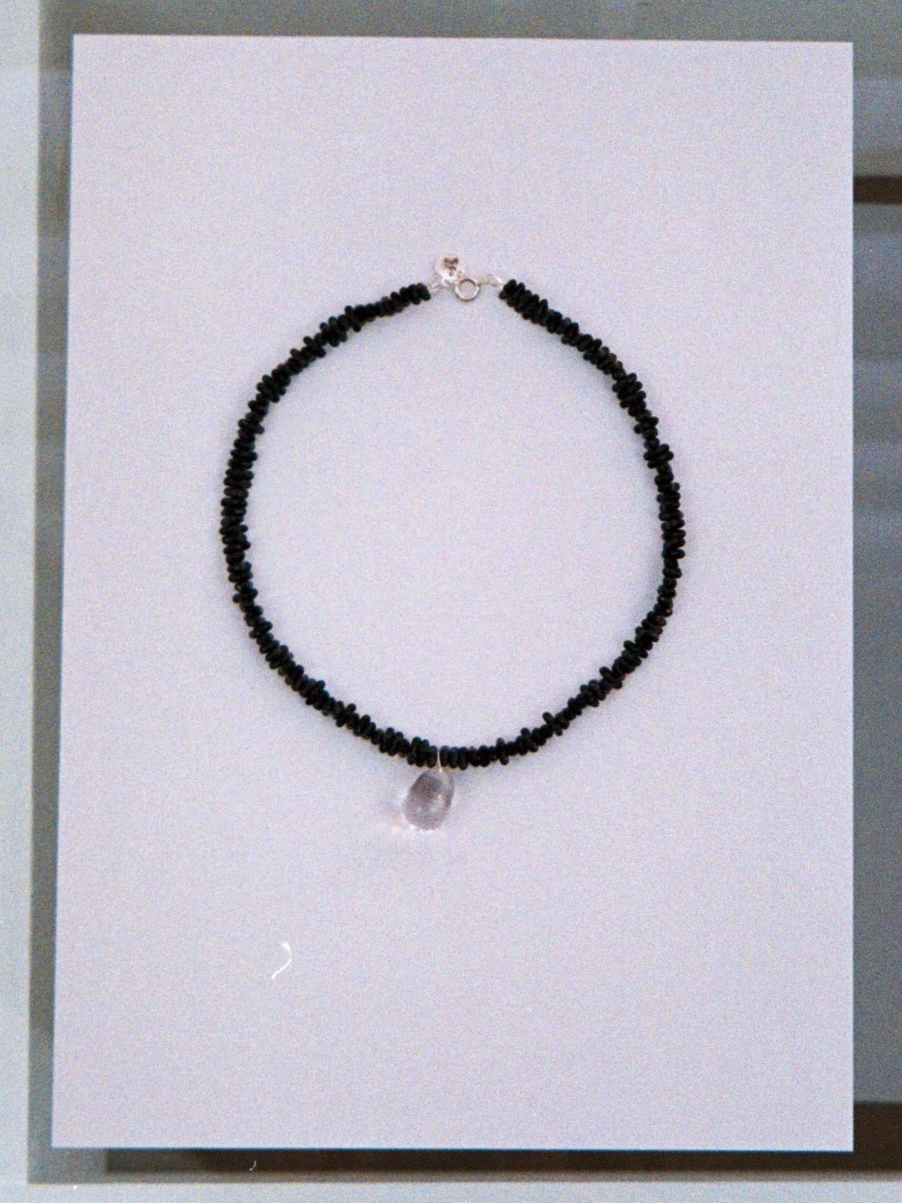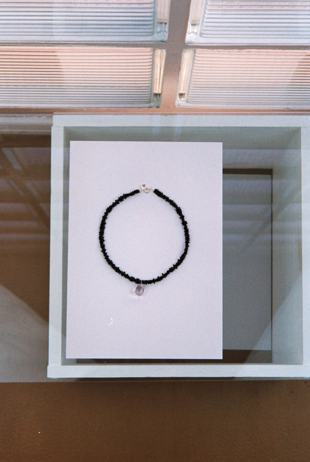 체코 유리 비즈와 글라스 드롭 펜던트가 돋보이는 초커 네크리스입니다.